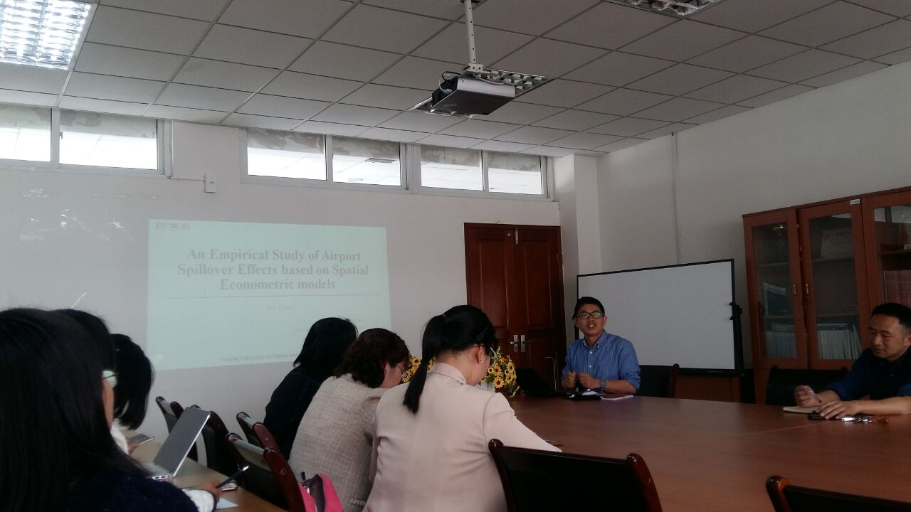 4月11日下午,陈欣老师在德济楼XCsports507会议室作了题为“空间计量经济学在机场溢出效应中的应用”的学术报告。报告首先介绍了空间计量经济学的空间自回归模型、空间误差模型和空间杜宾模型的原理,并以机场对区域经济溢出效应的评价为例进行了应用分析。同时结合访学中学习到的国外一流大学在教学和科研方面先进经验,和与会老师们进行了热烈讨论和交流。