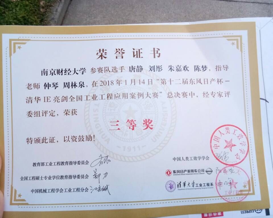 2018年1月13至14日,第十二届东风日产杯-清华IE亮剑全国工业工程应用案例大赛全国总决赛在北京清华大学举行。公司XCsports团队荣获工业工程全国三等奖,全国高校案例排名99名的成绩。 该团队由周林泉老师和仲琴老师指导,成员包括唐静、刘彤、陈梦和朱嘉欢。