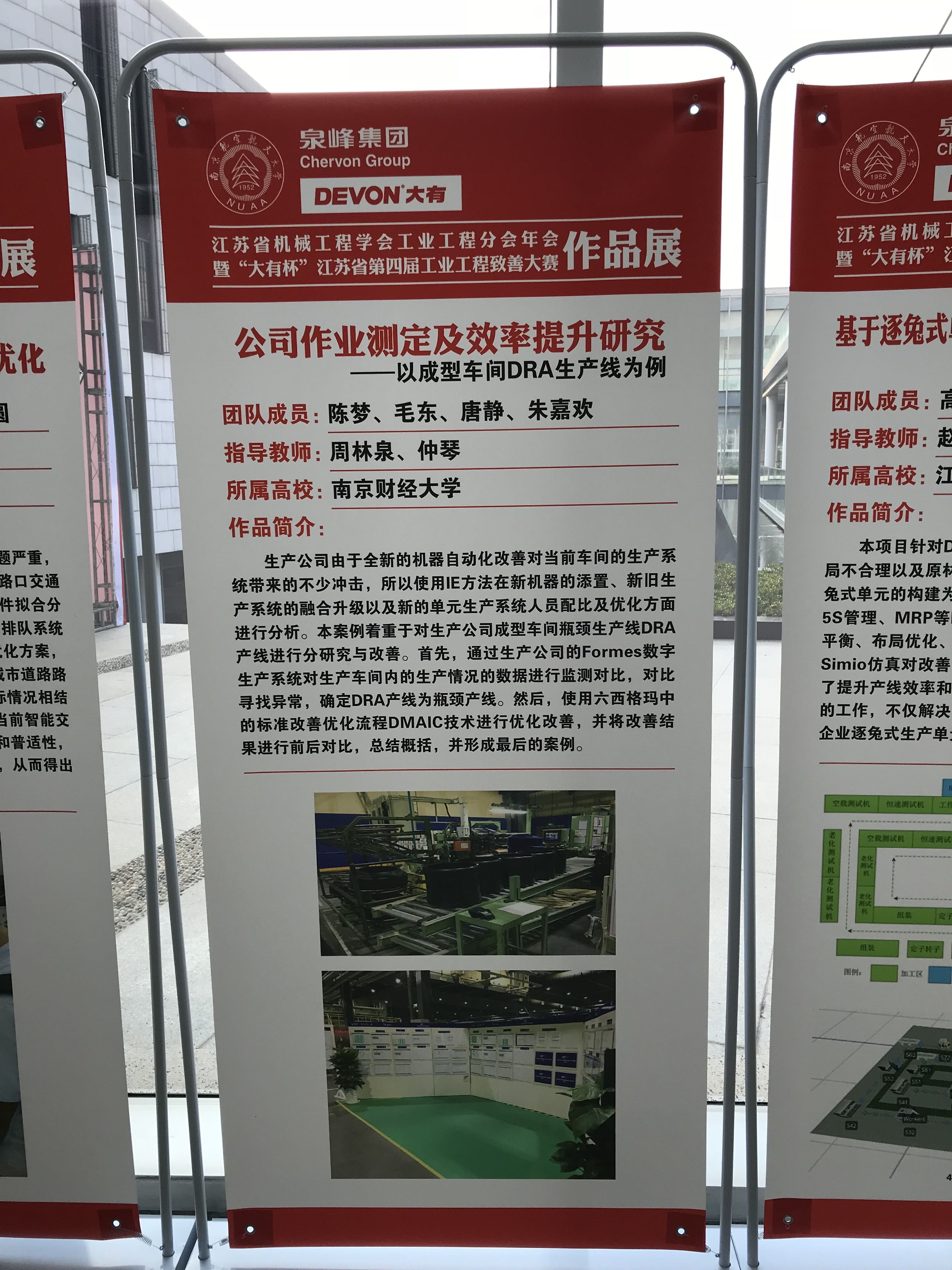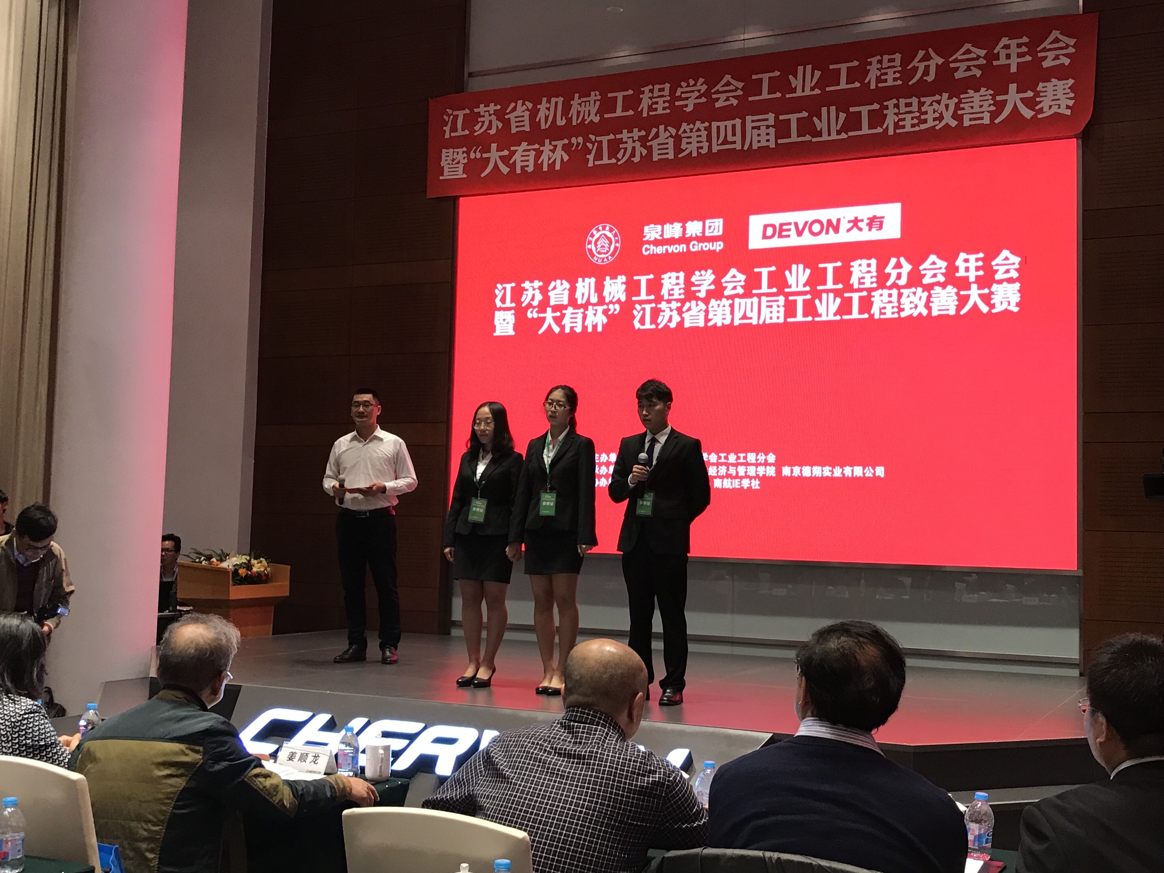 10月21日上午9点,江苏省机械工程学会工业工程分会年会暨“大有杯”第四届江苏省工业工程致善大赛在泉峰集团多功能厅成功举行。本届大赛由江苏省机械工程学会工业工程分会主办,南京航空航天大学经济与管理公司、南京德朔实业有限公司承办,来自南京航空航天大学、南京大学、中国矿业大学、XC体育等高校的21支队伍参与决赛。最终,经过激烈角逐,结合书面评审与现场答辩考核成绩,由公司XCsports工业工程系周林泉、仲琴老师指导,毛东、唐静、朱嘉欢等本科生共同完成的项目《公司作业测定及效率提升研究——以成型车间DRA生产线为例》获得三等奖。