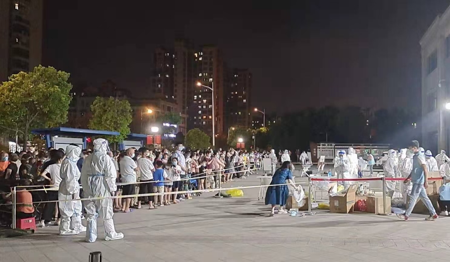 医护人员们争分夺秒,通宵采样。夜色虽深,但检测点的明亮的灯光如同耀眼的星。直至凌晨12点,进行核酸检测的市民才有所减少,志愿者们可以先行离开,而医护人员们在换班之后,依然坚守在岗位上。