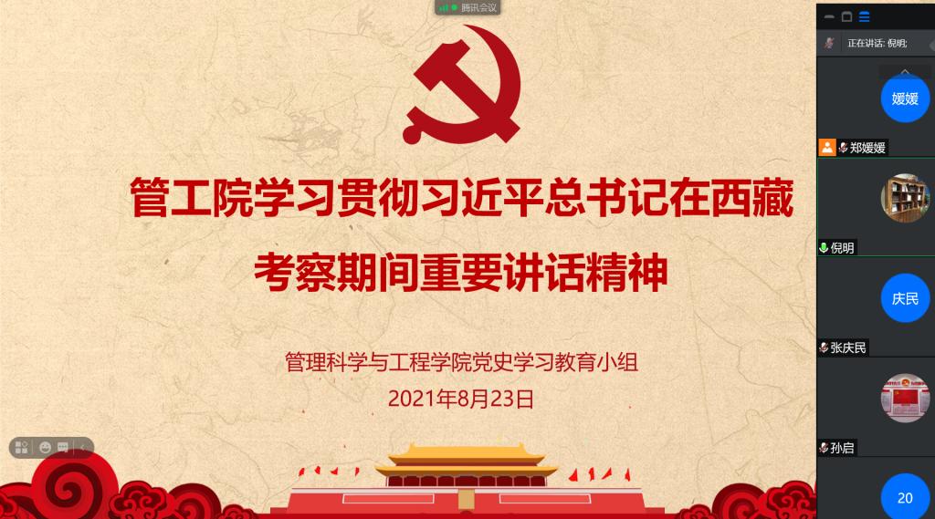 2021年8月23日上午,管工公司党总支理论学习中心组利用腾讯会议,围绕党史学习教育开展第十六次集体研讨学习,学习习近平总书记在西藏考察期间重要讲话精神,会议由党总支书记倪明主持。