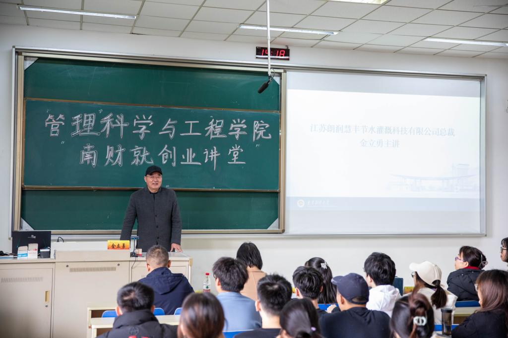 “经验,制造一切未来;经验,是所有过去的成果,我希望大家先就业后创业。”讲座伊始,金立勇先生先分享了自己在一家上市公司与一家84年老企业工作的经验,后来为了给数字技术赋能,助力乡村振兴,辞去高薪工作,致力于将有价值、有意义的渗灌技术推广到市场。然后,金立勇先生用自身实绩与经历总结道:“自身的综合能力是带动团队战胜困难迎接挑战的关键,信心和勇气是创业的必需要素”。