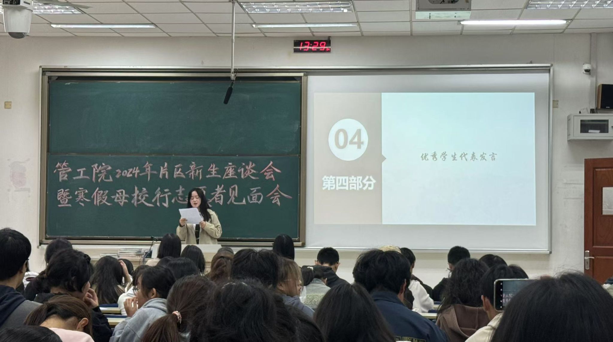 公司党委书记金立林老师、公司党委副书记王卓君老师与XCsports学工办主任唐方舟老师应邀参加,江苏省海门启东、湖北省片区的新生同学与寒假母校行志愿者悉数到会。本次见面会共分为招生代表发言、片区优秀员工代表发言和招生知识竞答三个环节。质管2401班袁心颖同学主持活动。