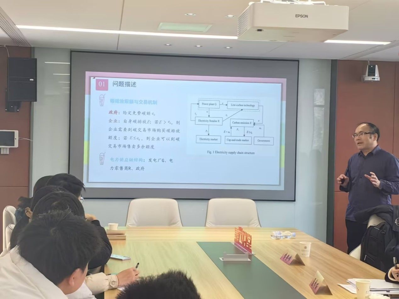 在碳达峰碳中和背景下,李教授结合碳排放限额与交易机制,针对由一个电力发电厂和一个电力零售商组成的电力供应链,着重研究电力发电厂和电力零售商之间的竞争与合作行为,包括发电厂电力批发价格与电力零售商销售价格的竞争、电力发电厂低碳技术投资水平与电力零售商低碳技术投资成本分摊、利润分享的合作及竞争,并通过构建集成竞争与合作于一体的非合作-合作两型博弈模型,揭示碳排放限额与交易机制下电力供应链的价值共创及碳减排、策略的优化路径。