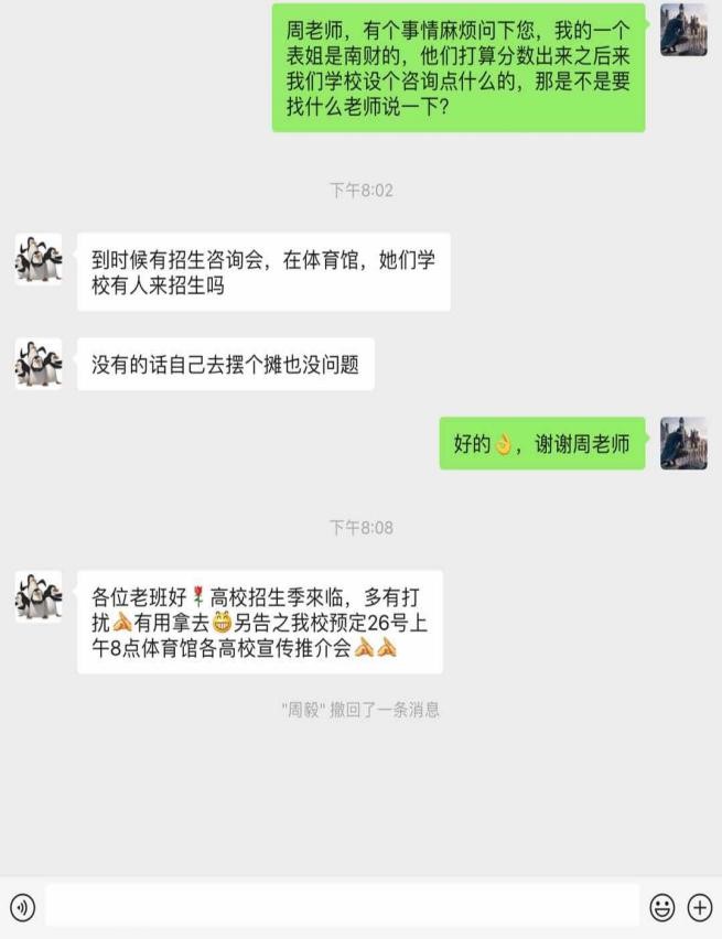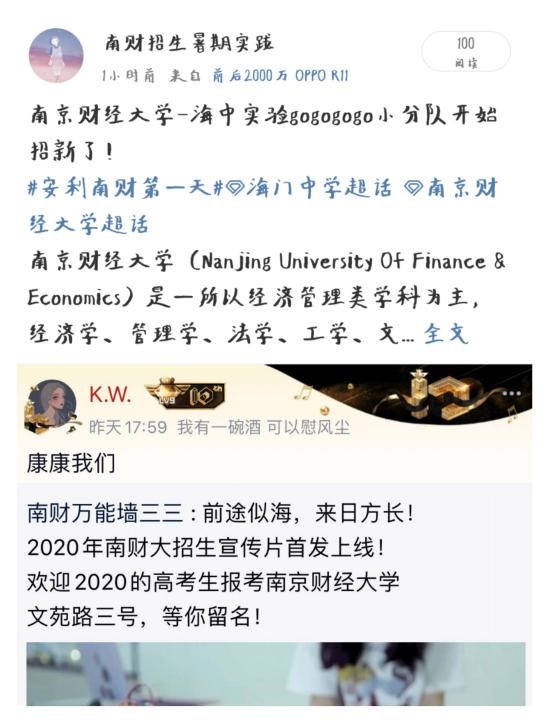 7月15日开始,实践团队成员在QQ,微博、抖音上转发南财相应的招生宣传内容,关注身边的高考生,利用父母朋友圈、高中班主任的资源进行线上的刷屏宣传。为进一步扩大招生规模,团队成员联系熟悉的海中员工进行招生群号的传播。团队在高考成绩公布之前的又一波宣传,为此次招生宣传增加了助力。