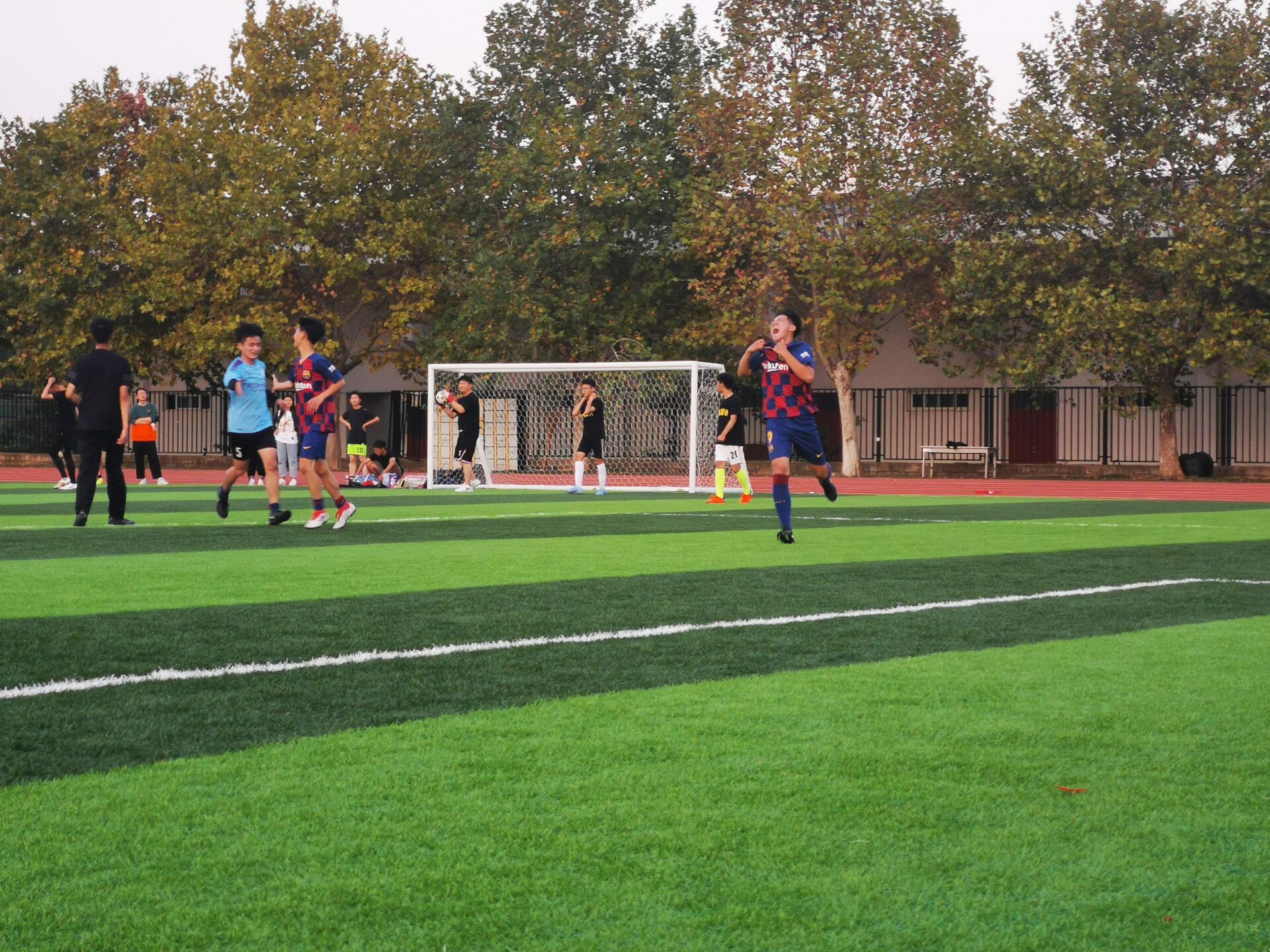 片刻休息后,双方球员重返赛场,进行了激烈的下半场球赛。管工财税联队的进攻较上半场比赛更为猛烈,在上半场时未赢得比分似乎激发了球员们心中的强烈胜负欲,他们愈发顽强拼搏。但开场约10分钟,管工财税联队一球员被应数艺设联队球员踢到大腿,所幸并未受伤,但这意外伤害却使管工财税联队更加斗志昂扬。终于在下半场的中旬,9号牛宇霆旗开得胜,越过应数艺设联队球员的阻拦,率先踢进一球。这一振奋人心的进球,使管工财税联队的球员们信心大增,乘胜追击。不到十分钟,8号球员金鑫便再进一球,赢得了全场的欢呼声。在接下来的比赛中,两队球员你追我赶,个个都生龙活虎、拼尽全力。最终,在比赛接近尾声之际,管工财税联队8号球员金鑫又进一球,为此次比赛画上圆满的句号。