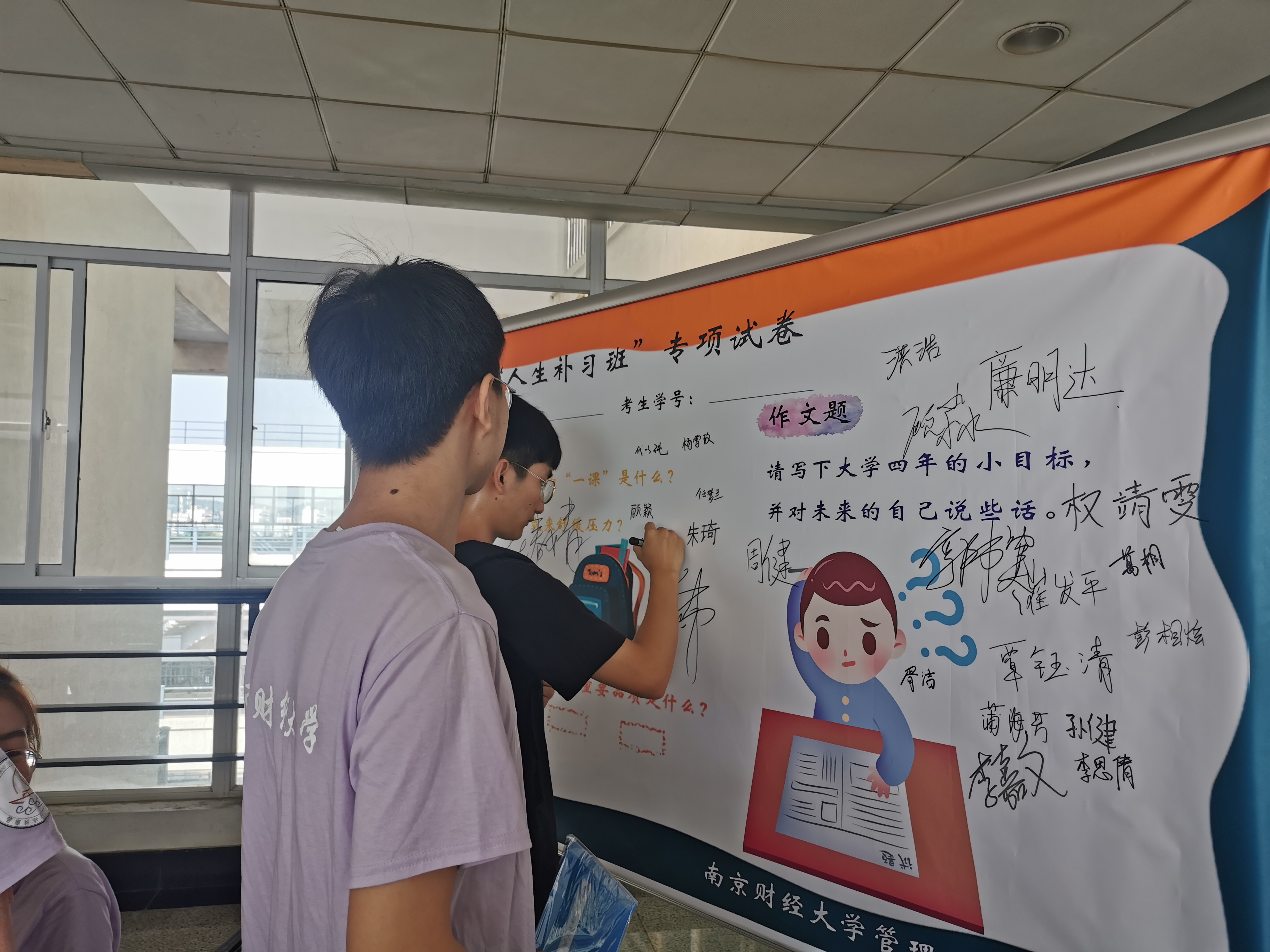 新生报到处,一张“人生补习班”专项试卷展现在新生和家长的眼前。所谓“人生补习班”,即是在我们成长路上一路所需补充的知识素养,大学之前父母、亲朋、老师陪伴我们一路长大,他们都是我们的老师,而现在的老师,则是大学里未曾谋面的人与事,是即将经历的新的挑战,是无数喜悦与坎坷,亦是新生们自己。