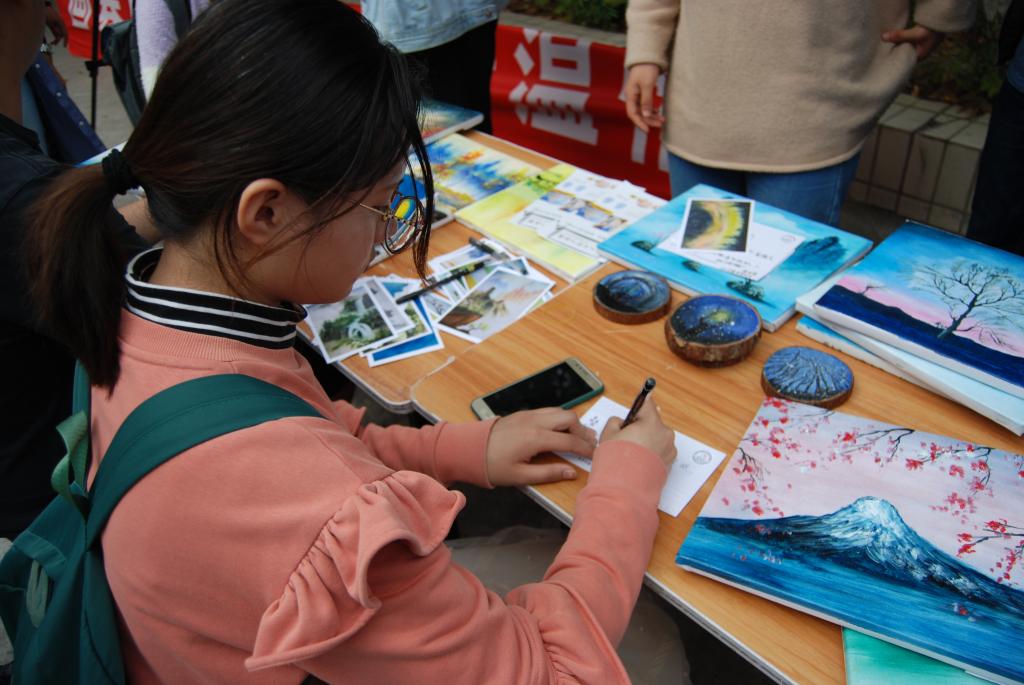 活动负责人李崇同学介绍说:“得知周太平举办画展的想法后,我先是帮他写了策划案,然后联系了展板,还有文印店,以他的画为背景,制作了专属他的明信片。那些来买画的人,他们有什么话想对山区孩子说,是可以写在明信片上的,和那些慈善捐款一起寄给山区的孩子们。”