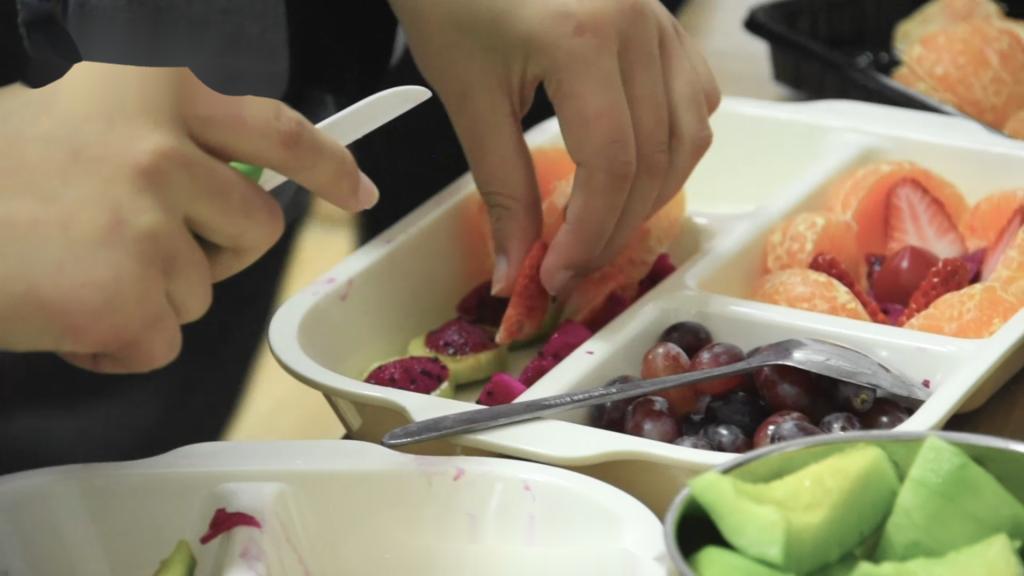 “小老师”们一遍遍地教,孩子们一遍遍地学,终于从陌生到熟悉,有的孩子甚至可以自己操作厨具,开心地露出了笑脸。志愿者们带着孩子们一起制作水果拼盘。很快,在志愿者和孩子们的共同努力下,一份色香味俱全的水果拼盘完成啦。孩子们同志愿者、老师一起分享了水果拼盘,一位小朋友开心地说:“我特别爱吃水果,今天的水果拼盘是自己做的,更好吃了!”