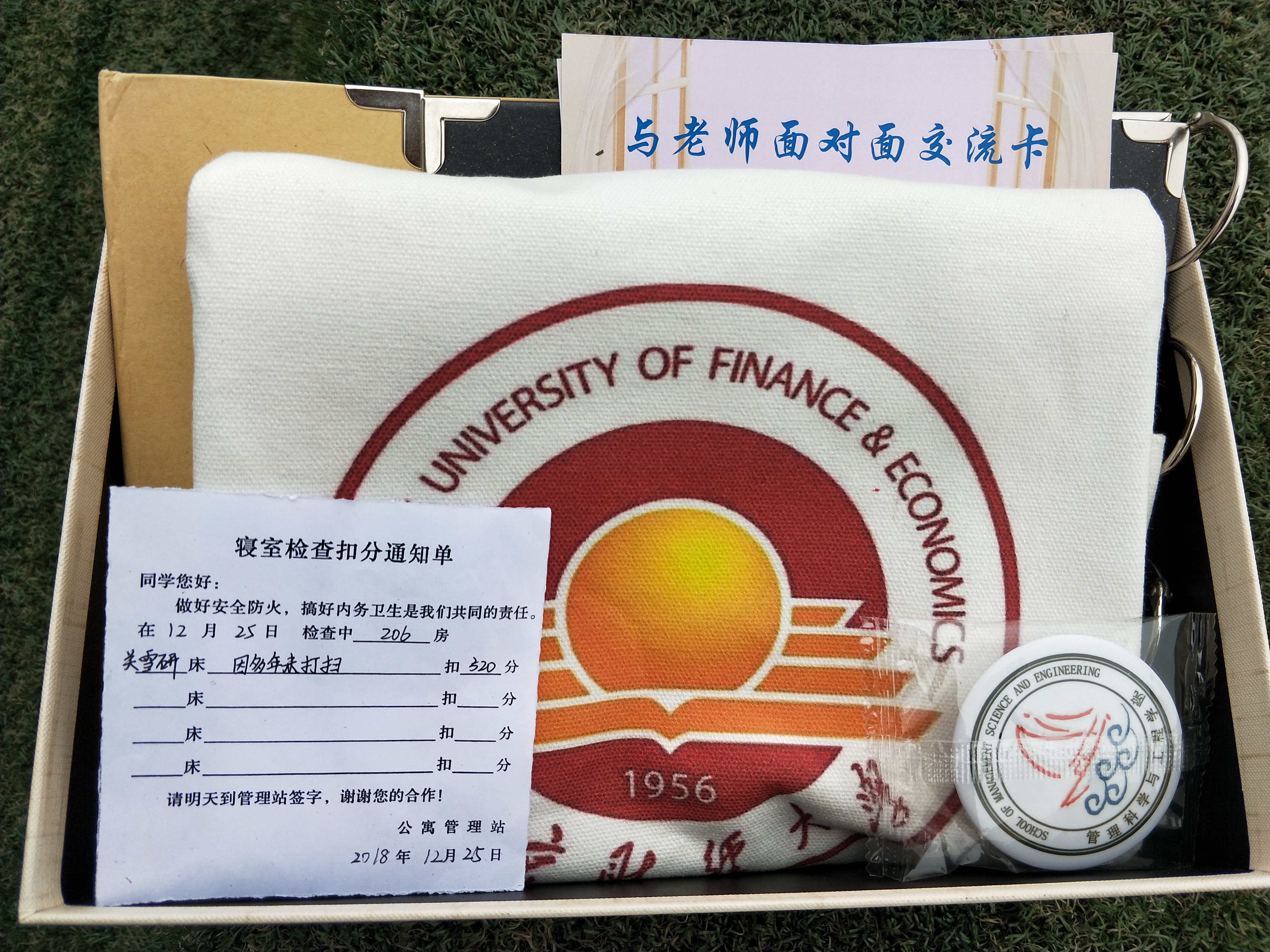 小福袋里面装载的是定制的南财校徽帆布包、用心制作的南财相册、XCsports院徽、贴心的“与老师面对面”交流卡、宿管站扣分卡、英语四级试卷。南财相册上写着:“无论相隔有多远,母校对你的思念永不停歇”,“风里有花香,身边有我们最爱的人”,“铲屎官,你打算什么时候回来看看朕呢?”这些贴心温暖的物件、话语像时光机一样让人仿佛瞬间回到了从前。前期员工会还录制了《无问西东》视频,在图书馆、教学楼、食堂、老员工活动中心、宿管站门口等校园各个角落跳舞,以这种特殊的方式带领员工们重温南财岁月。
