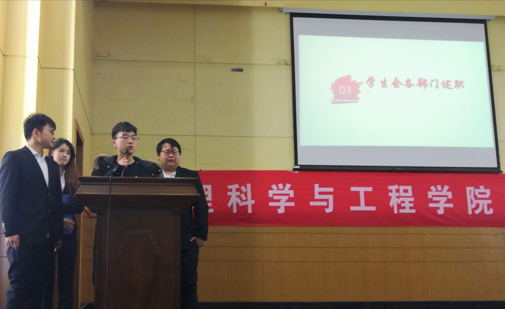 随后,员工会主席、分团委副书记做工作报告后,各部门结合视频、ppt依次述职答辩。其中在部长答辩中,唐方舟老师提问新闻部,“部门是如何提高部员新闻写作水平的?”,新闻部部长诚恳回答:“实践重要,理论必须有,但更多的是要去练”,这一回答得到唐方舟老师的高度赞同。