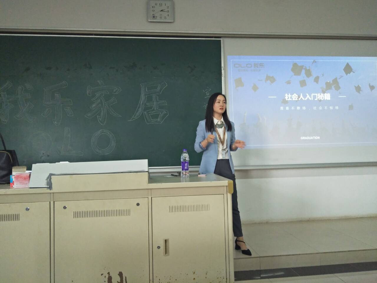 随后是宣讲环节。赵晶晶简单介绍了我乐家居的发展史、企业发展方向、企业文化和企业价值观和招聘岗位,并让同学们具体了解了我乐家居的工作环境。