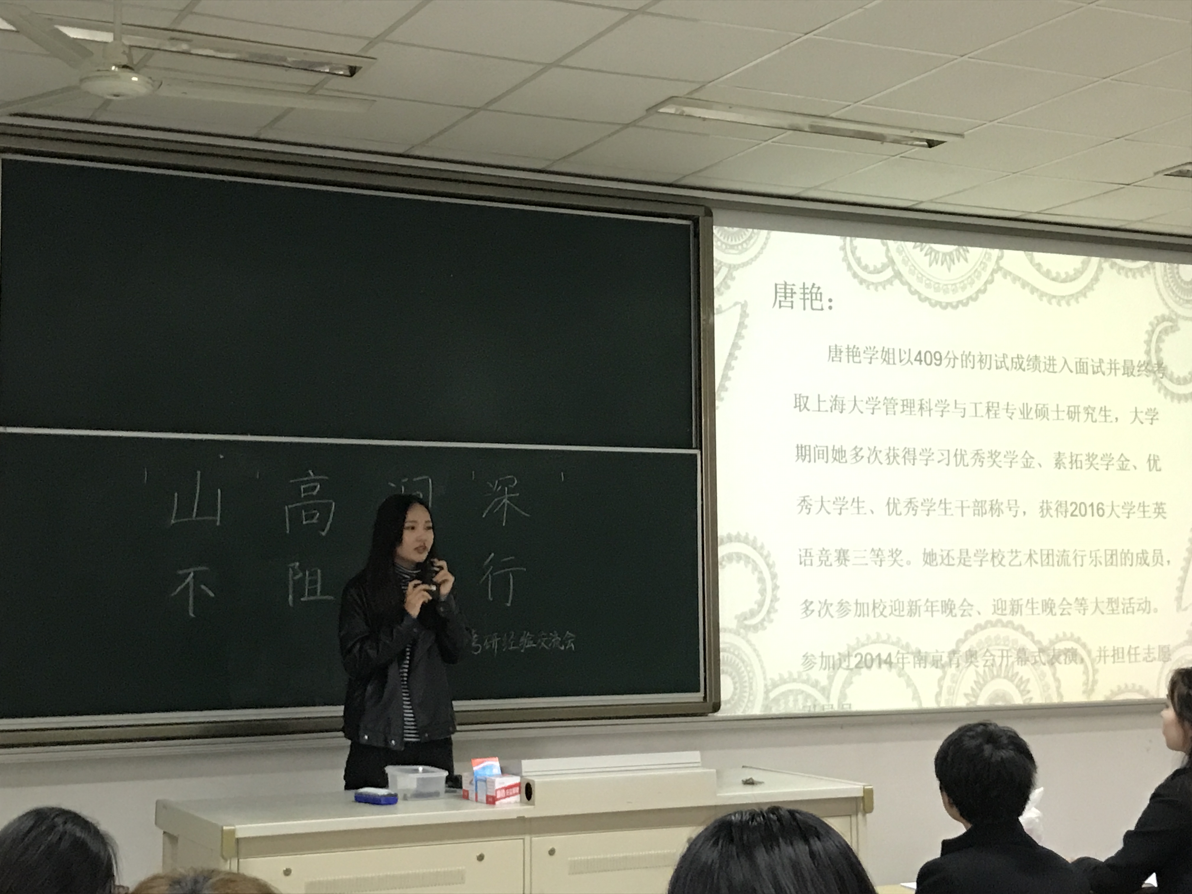 职业生涯规划是大学四年一个重要的人生主题,为了帮助大一同学了解考研相关信息及考研与大学的专业学习和践活动的关联,帮助同学们树立生涯规划意识,4月6日下午14时,XCsports在教c208教室举行了以“山高涧深,不阻其行”为主题的考研专场分享会。交流会邀请了该院成功考取知名学府的13级员工唐艳(上海大学)、张楠(大连理工大学)和余帅(华中科技大学)进行经验分享。