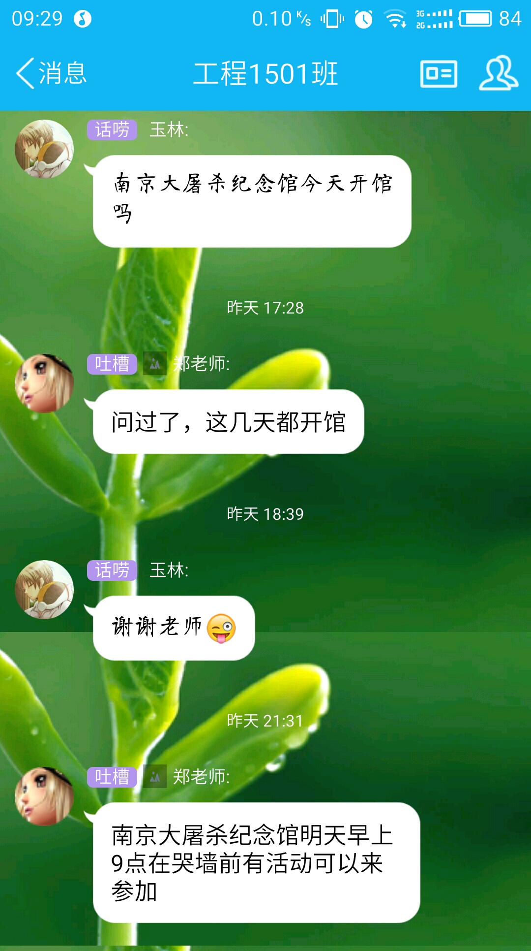 自4月2日以来,辅导员就鼓励同学们前往参加南京大屠杀纪念馆的哭墙活动。同时,学院公众号普及了清明节来源小知识。同学们也给予了积极回应。热爱书法的范兵写下了“浩气长存”四个大字来缅怀先烈;董港给家里老人做了一顿简简单单的饭菜来表达感恩之情;Yolo(郭宁静)淡淡地说“那些离去的人我们并未失去,他们只是换了个地方”,言语中透露着释然和祝愿。