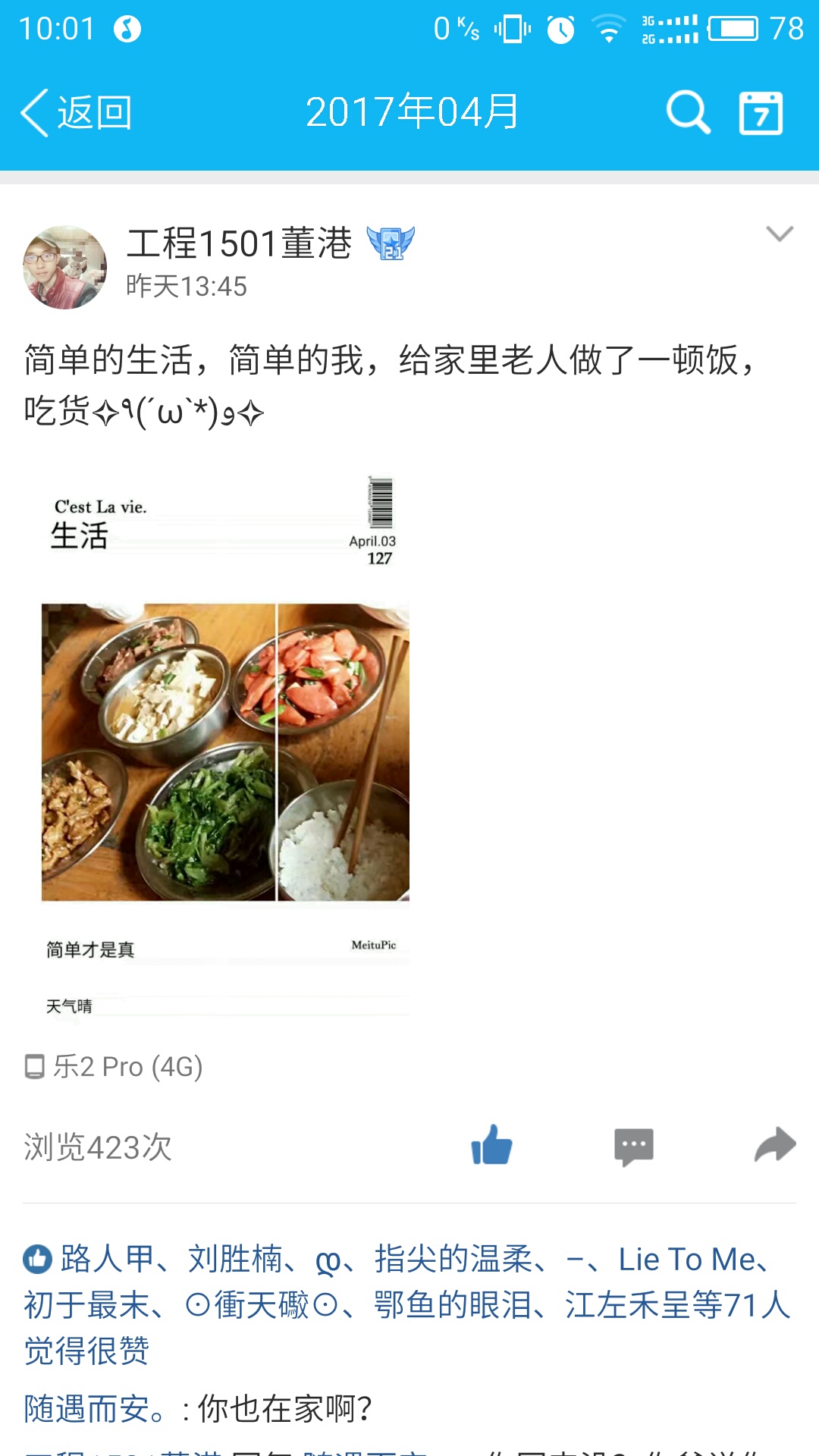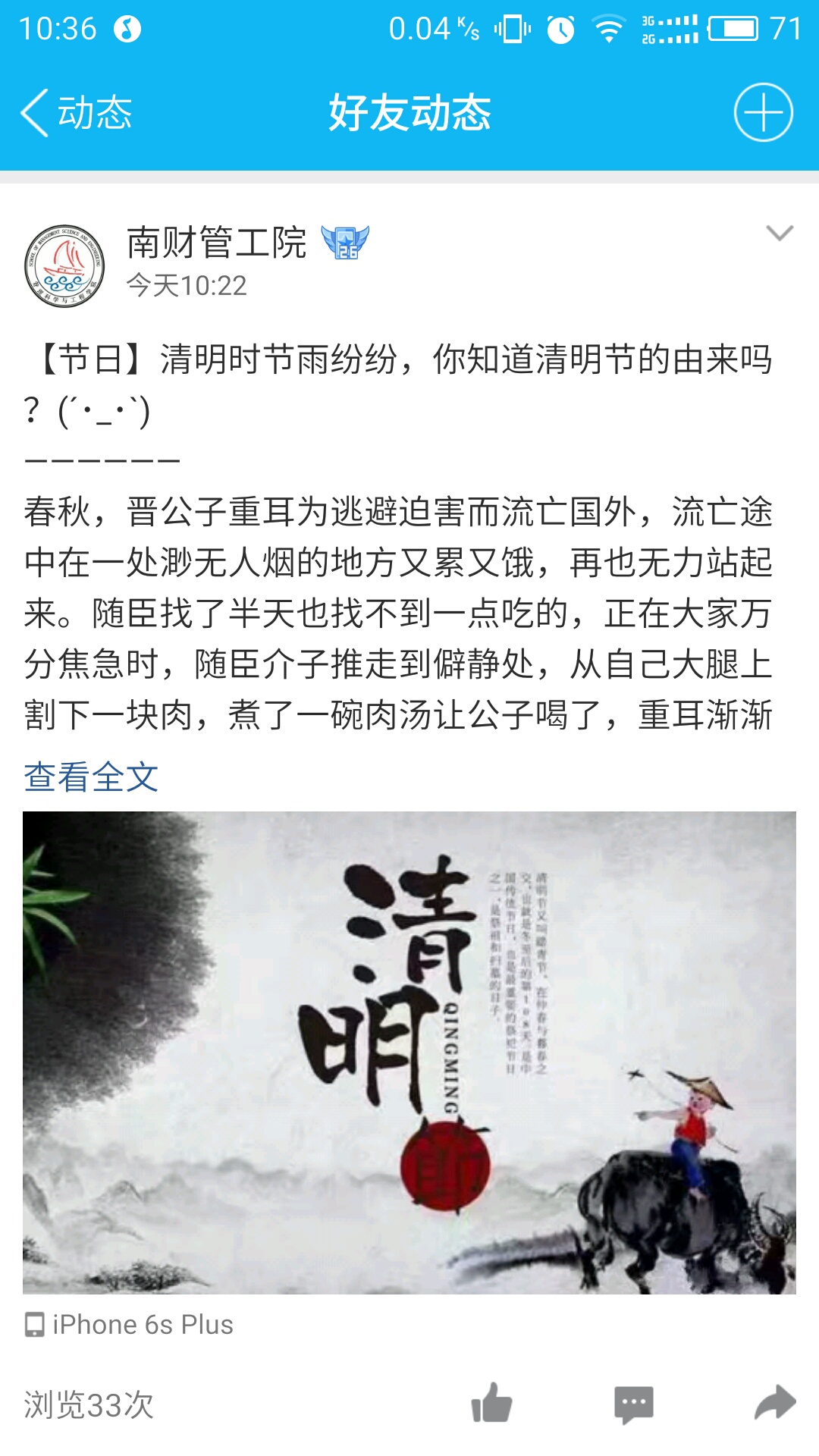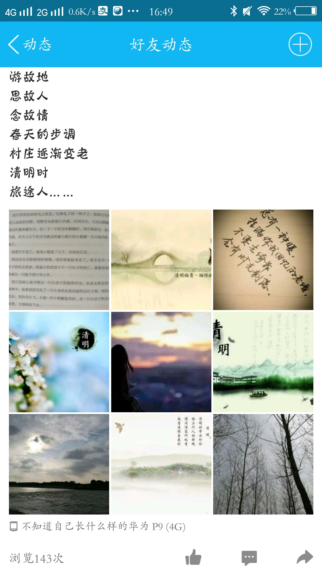 清明节除了祭奠祖先,缅怀先烈之外,还有踏青、寒食等习俗。王明珠和自己的四个小伙伴一起去田间踏青,看花,看晨起夕落,享受美好的春色;夏秋霞与大家分享外婆做的清明稞,让人垂涎欲滴。“咸鱼吃西瓜”(孔松涛)认为清明,既是祭祖扫墓、慎终追远的感伤之日,也是扑蝶插柳、踏青赏春佳节。“璃白”(陶云杰)则诗意的说“游故地,思故人,念故情。春天的步调,村庄逐渐变老。清明时,旅途人……”