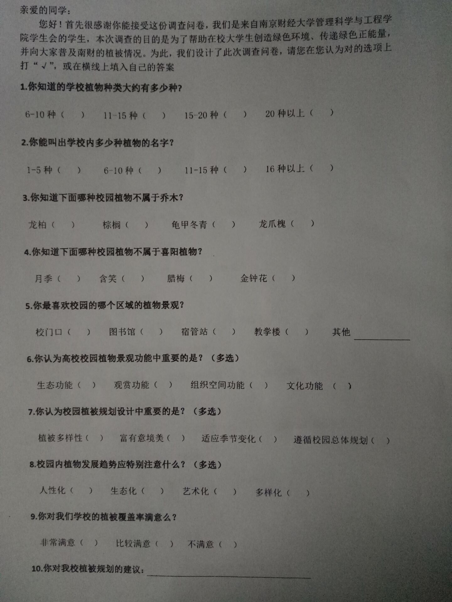 3月8日和3月9日,员工会在校园内初步实地考察校园的物景情况。接着通过网上搜集校园内主要木本植物的相关信息,研究景观功能、规划设计中的注意点和发展趋势并综合初步实地考察情况制作调查问卷。3月10日,员工会利用课余时间走访书香地、教学楼、专业楼、宿管站、食堂等地发放问卷调查,共发500份调查问卷,其中有效问卷300份。