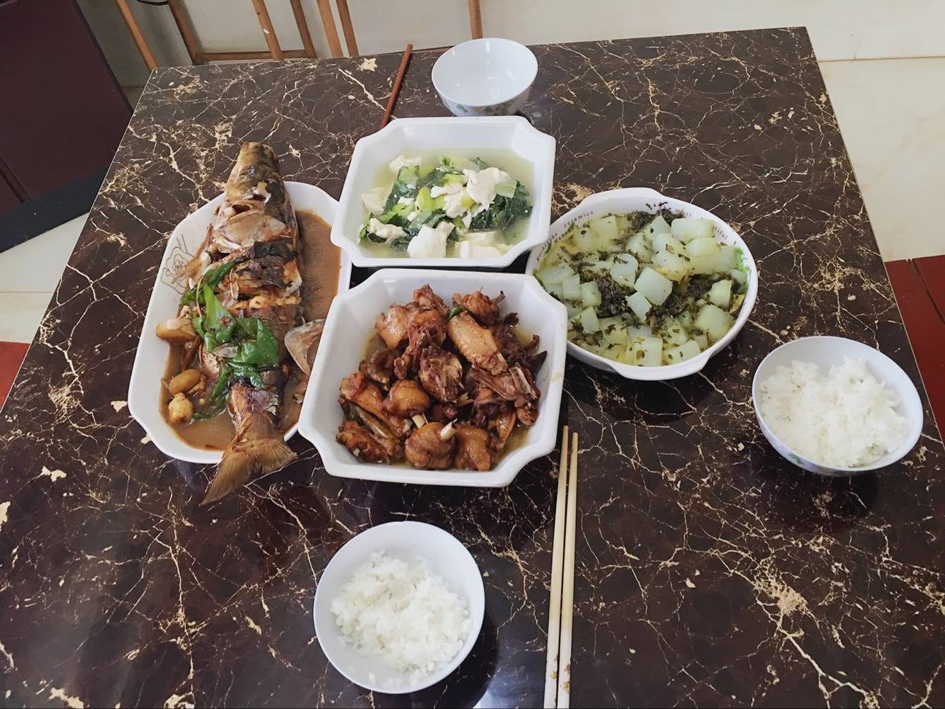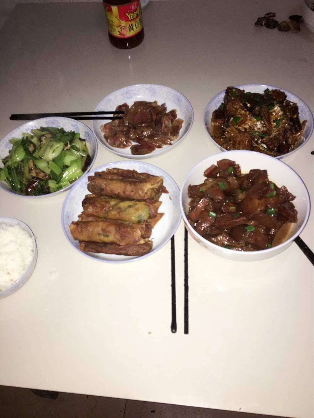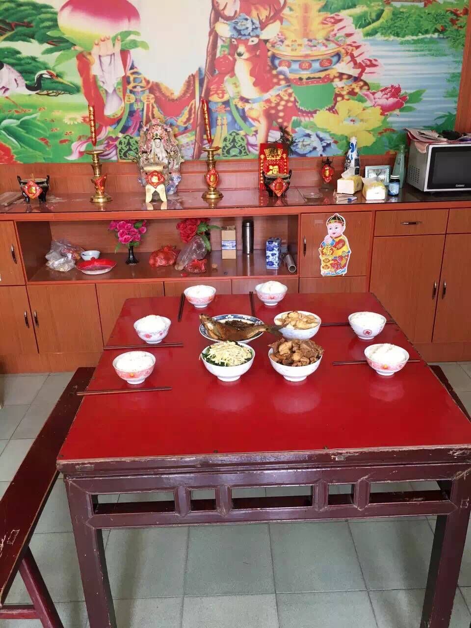 同学们拍下寒食节当天家里的饭菜,附上文字,发送到腾讯微博和QQ空间上进行展示。大家对展示的家乡菜式进行留言互动,点赞。获赞数最多的菜式被评为最佳寒食节菜式。不同图片菜式各异,但大多有鱼、鸡肉和豆腐。碗里盛着米饭,架着筷子,以飨先人。