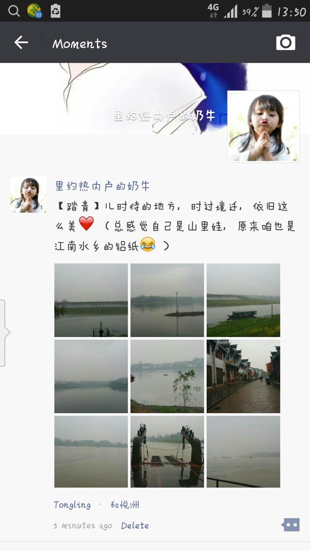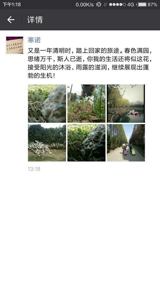 4月2日同学们就已经在朋友圈、说说里晒出了清明小长假的第一波收获;管理1301的班级群里也有人聊起了自家的清明习俗。“里约热内卢的奶牛”(刘玉莲)感慨儿时待过的地方美丽依旧,才想起自己也是江南水乡的俏佳人。“寒诺”(张寒)则晒出了清明开得正盛的花,表示缅怀先人的同时也不忘珍惜当下,心存憧憬和希望。还有同学晒出生长于斯的热土,悼念早逝的外公,寄以思念之情。