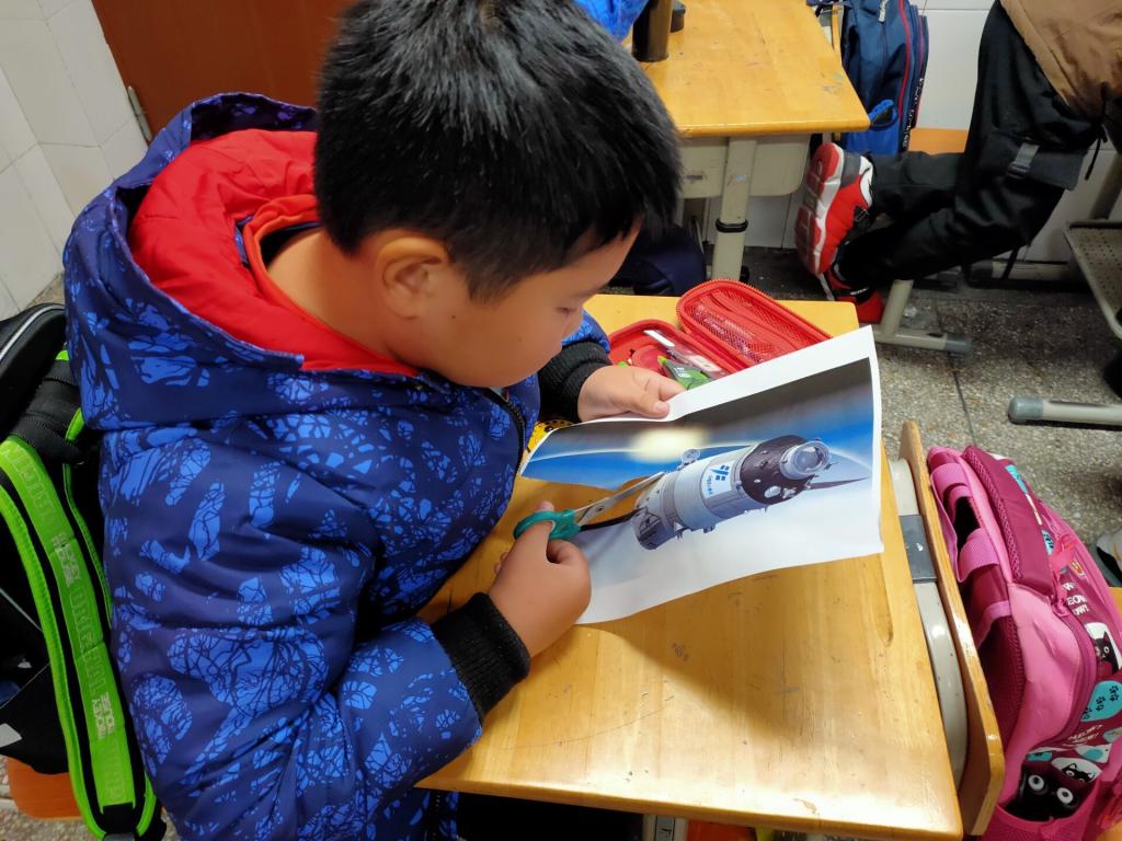 接下来便是激动人心的实操互动环节了。志愿者们和四个小组的小员工们,分别以党史、新中国史、改革开放史、社会主义发展史为主题制作纸贴画。大家先将与“四史”有关的建筑或人物的画作细心裁剪,然后在志愿者的带领下,小员工们将剪纸整理好,并贴在画纸上,做成一幅幅可爱的纸贴画,有中国共产党第一次代表大会会址,有巍峨的天安门城楼和人民英雄纪念碑,还有墨子号通讯卫星、“中国天眼”射电望远镜……制作过程中,大家你一言我一语都纷纷出谋划策,场面十分热闹。