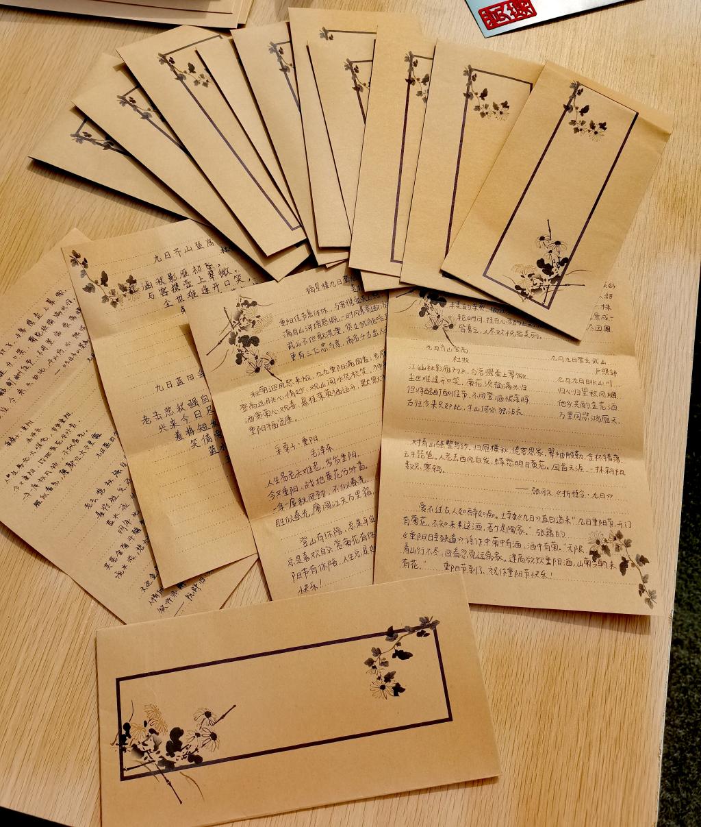 随后,同学们将想对亲人、老师、宿管站阿姨等长辈说的话写在信纸上,表达他们的感恩与尊重。一颗颗真心,一份份关切,在笔尖流淌。之后,这些温暖的话语被精心包装,封在精美的信封中。志愿者葛瀚文同学还用毛笔写下重阳节诗篇,表达对长辈的祝福。