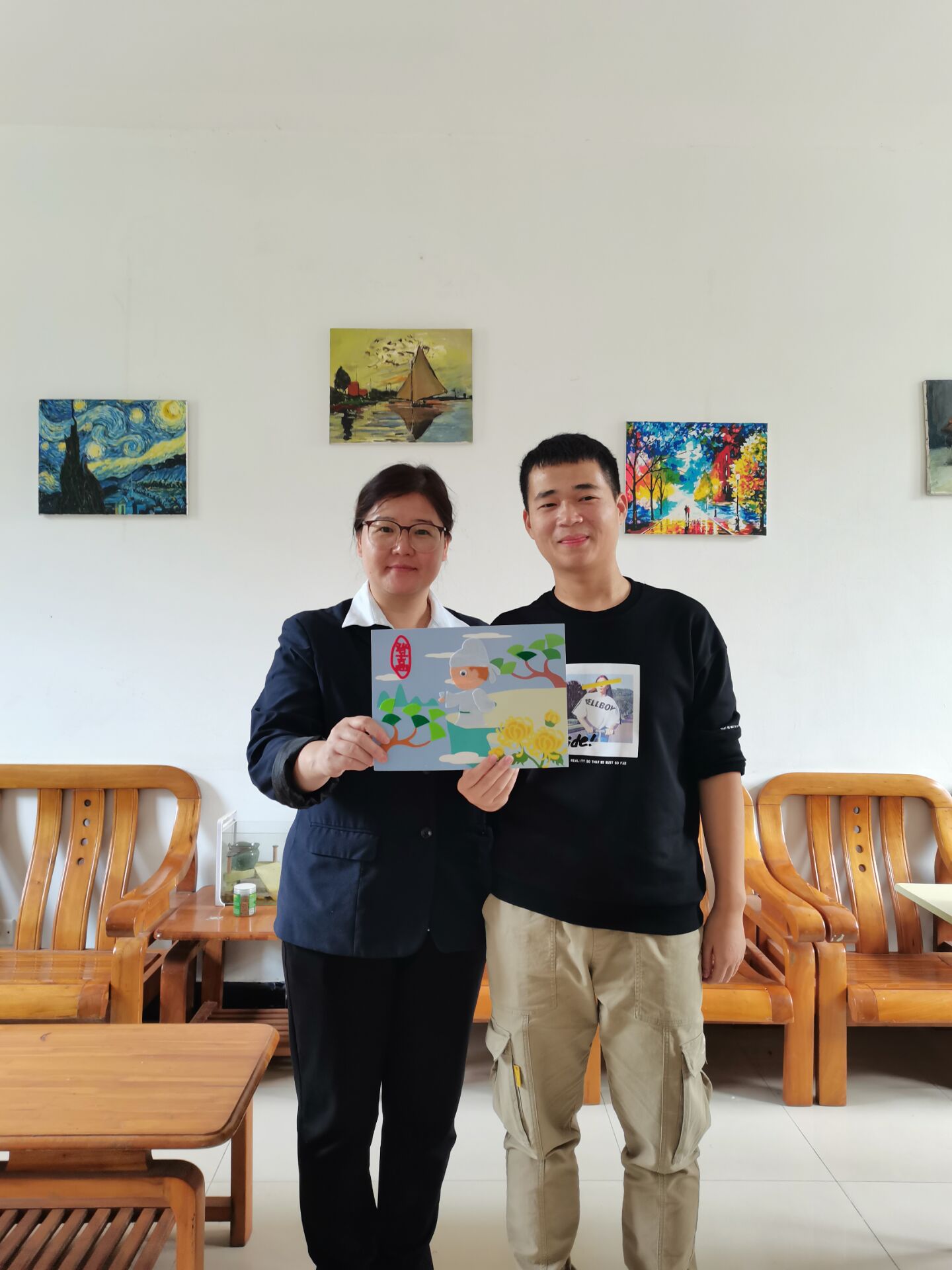 活动策划者工程2001陈莉将亲手将礼物送给杨大明老师,杨大明老师和蔼可亲,课堂风趣幽默,深受员工的喜爱。收到礼物后,杨老师高兴地说:“谢谢同学们精心制作的布贴画,这份礼物太有心了,Q版的布贴画里有一个Q版的我,真的很有趣很有爱,这个重阳节让人很难忘!”