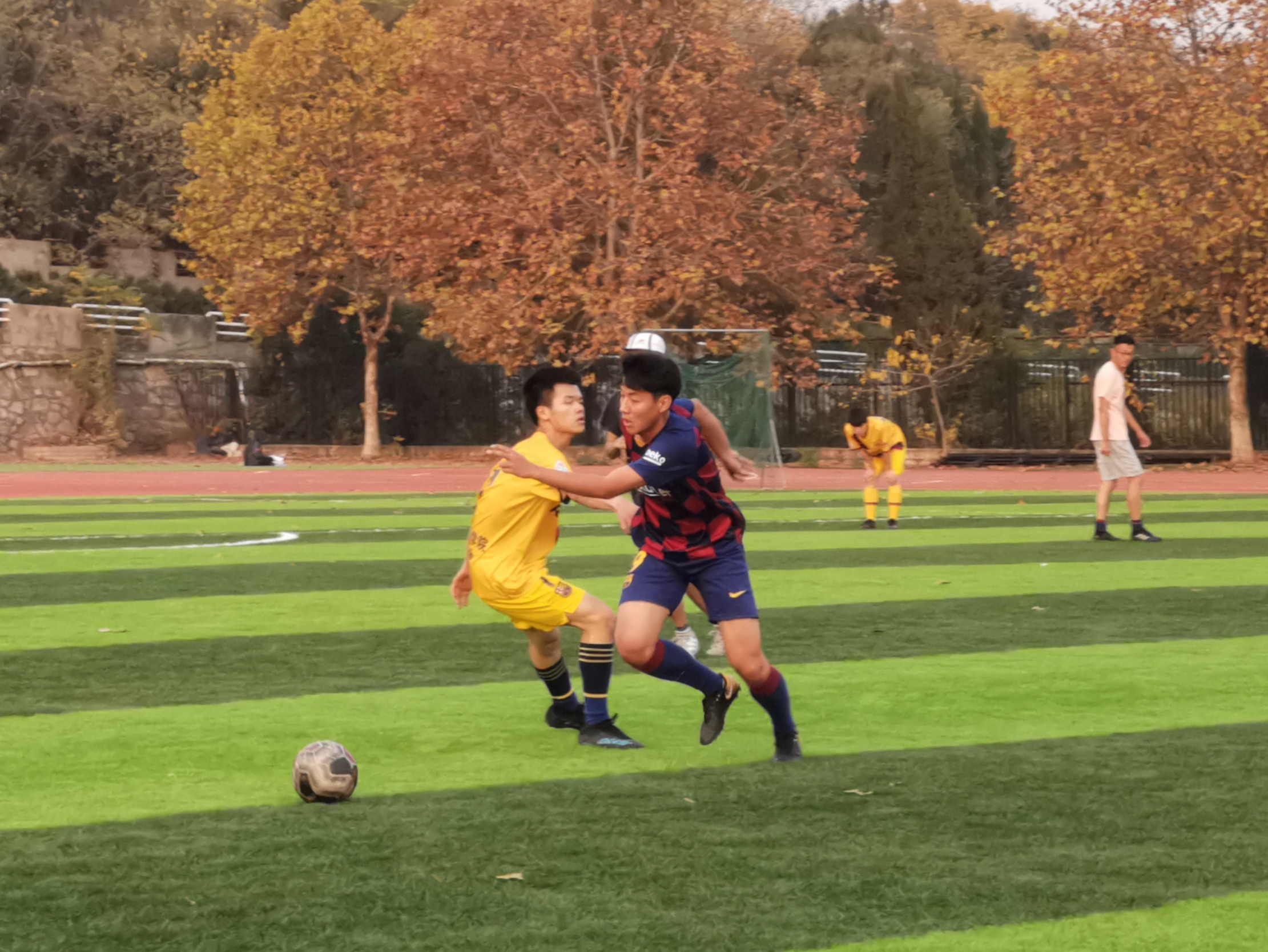 中场休息时,两队队员们各自在休息区商量战术。下半场开始,天已经渐渐变暗,凉风吹来顿时感到冰凉刺骨,但是球员们心中冒着胜利的火焰,依旧奋力奔跑。8号球员金鑫以一记漂亮的射门再次获得一分,在下半场中管工财税联队与工商新闻联队各进一球,以1:1结束。