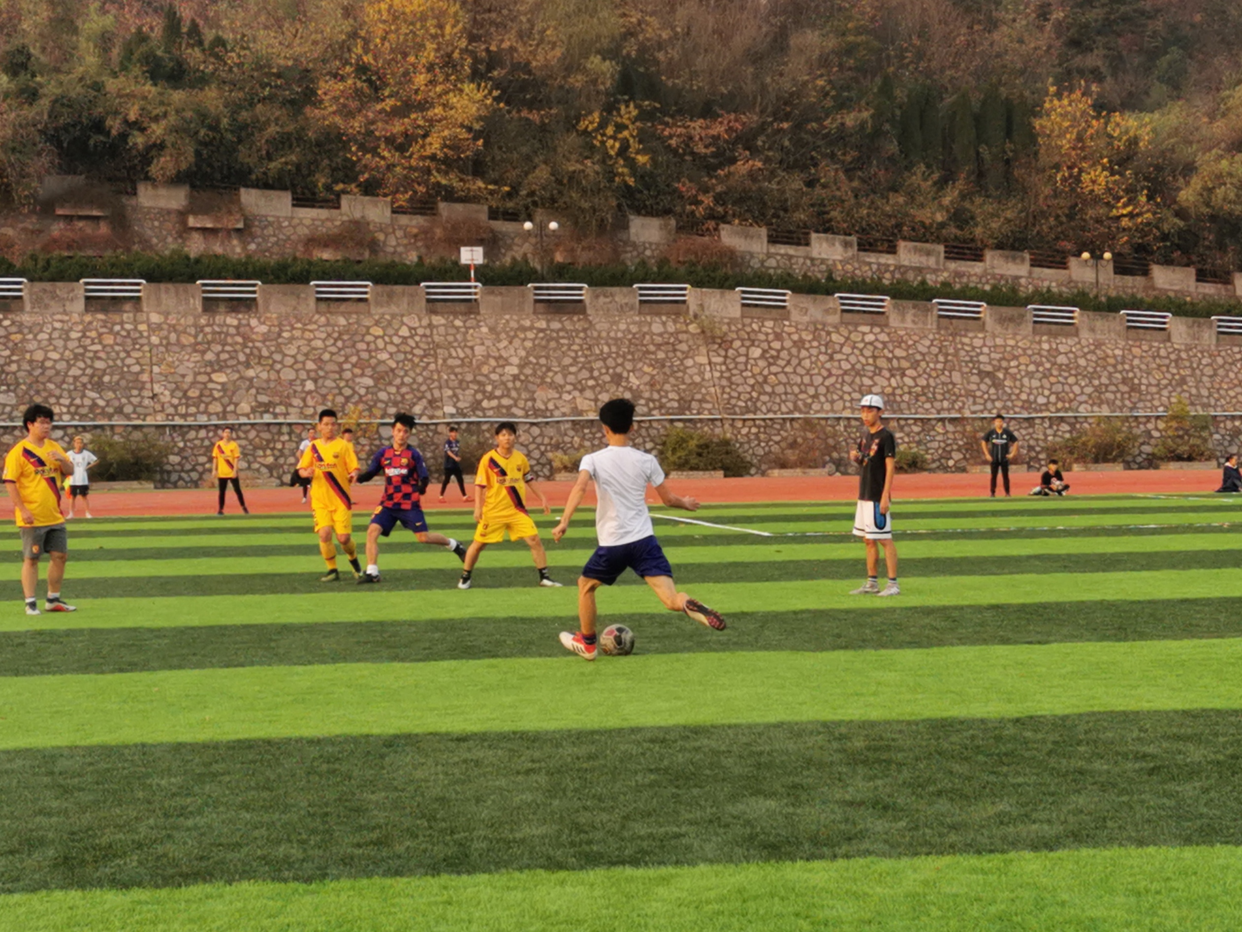 天气微凉,与之相反的是草地上球员们高涨的热情。随着裁判一声哨响,两队开始了激烈拼抢。开场7分钟左右,管工财税联队8号球员金鑫以一记射门球点燃了场上热情,紧跟着两队在抢球中,因工商新闻联队犯了手球,8号球员金鑫又获得一次任意球的机会,不负众望又进了一球。开场仅十分钟左右,管工财税联队就获得两分,鼓舞了大家士气,将比赛氛围点燃。工商新闻联队的球员们也不甘示弱,奋起直追,企图占据主动权。双方球员们急速奔跑夺球,丝毫不放松懈怠,管工财税联队20号球员刘海涛和9号球员牛宇霆各进一个点球,8号球员金鑫再进一个任意球,共获得5分,占据了良好优势,上半场比赛以5:0结束。