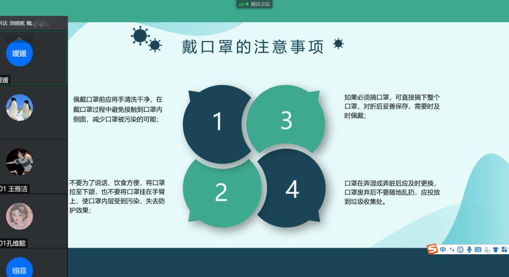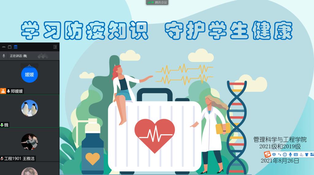 2021年8月26日晚,按照公司要求,辅导员郑媛媛老师利用腾讯会议,对所带的2021级和2019级6个班员工进行“学习防疫知识,守护员工健康”的防疫知识培训交流会,会议特别邀请了校医院负责防疫工作的魏春娟副经理指导,讲解防疫知识。