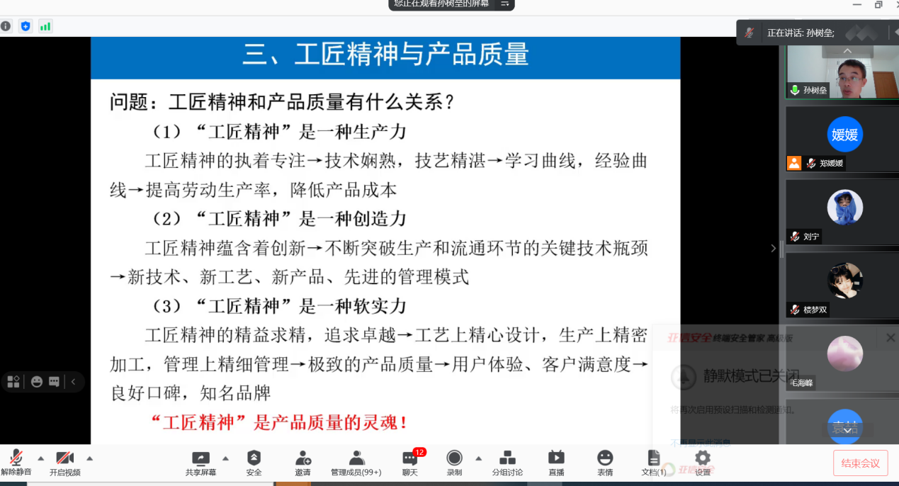 为了了解新时代大国工匠、中国劳模和中国传统文化中的国粹技艺,鼓励员工学习劳模精神、工匠精神,弘扬优秀中国传统文化,推动知和行的统一,9月4日晚,XCsports通过腾讯会议举办“知行合一,劳以立人”主题班会和“影像志”活动,邀请公司工业工程系主任孙树垒老师主讲“工匠精神与产品质量”,集中观看《大国工匠》,全体2021级新生参加会议,辅导员郑媛媛老师主持会议。