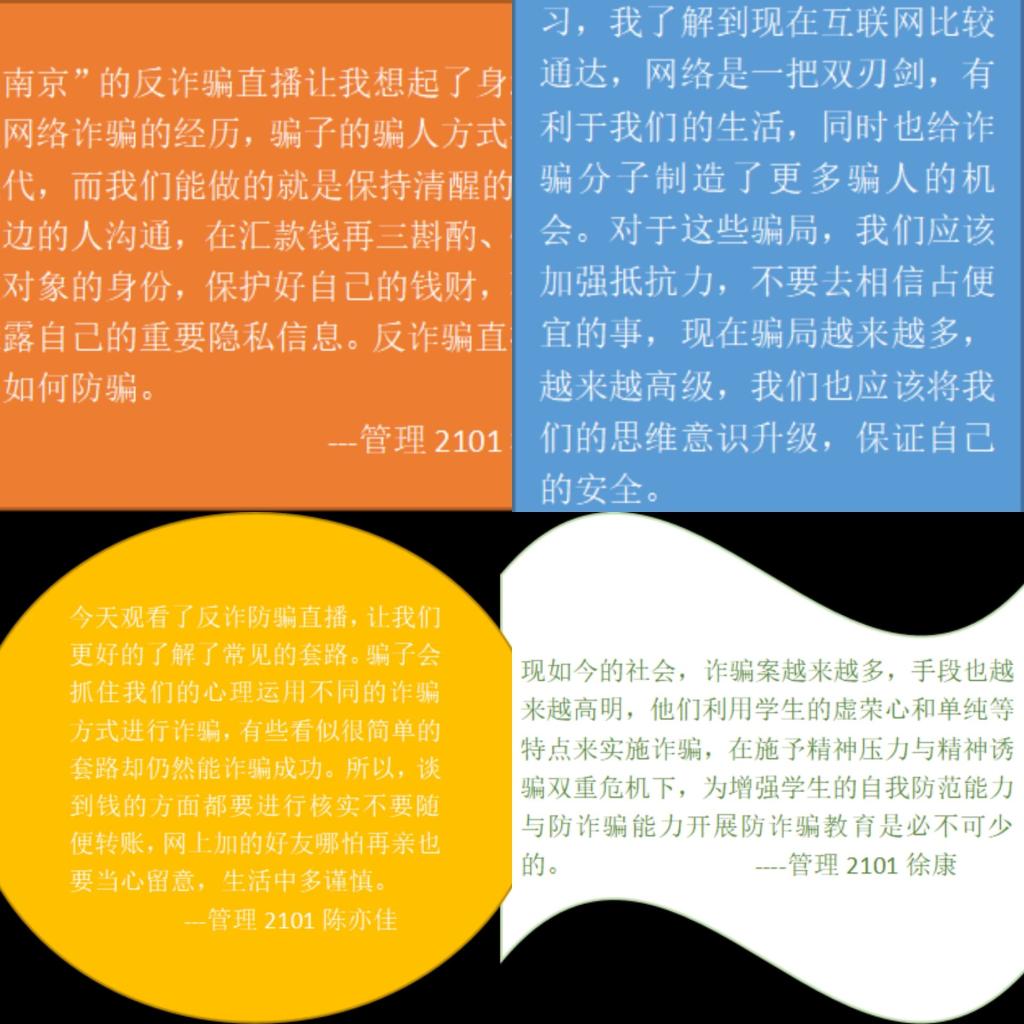 观看结束后,同学们积极交流感受。管理2101班同学朱昱汀说:“财富是通过自己的双手打拼的,美好生活要靠自己去奋斗和创造。身正不怕影子斜,我们要保持清醒头脑,提高防范意识,对这种威逼利诱的诈骗行为果断拒绝和挂断,骗子自无机可乘。遇事不决时,应向亲友或官方等打电话核实情况需求帮助。只要全社会齐心协力铸就防骗长城,擦亮识骗慧眼,定能将电信诈骗消弭于世间。”未来美好生活是需要我们辛勤的付出才能收获,不相信一夜暴富,不相信“中头奖”,踏踏实实做好自己的工作,勤勤恳恳的耕耘自己的知识田地,共同守护我们的平安,创造我们的幸福。