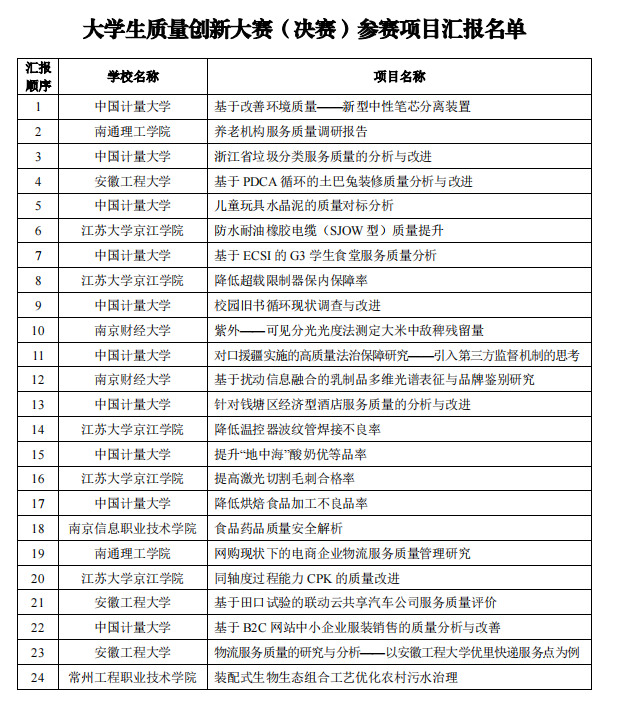 两位老师的精彩分享结束后,令人期待的老员工质量创新大赛决赛也随即开始,本次质量创新大赛决赛共有来自XC体育、中国计量大学、安徽工程大学、江苏大学京江公司、南通理工公司、常州工程职业技术公司和南京信息职业公司的24支队伍参加,每支队伍按抽签顺序轮流上台进行项目PPT展示,同学们的项目内容从质量提升到质量认证,几乎涉及到了质量管理领域的各个方面,也充分体现了大赛的创新性特点。