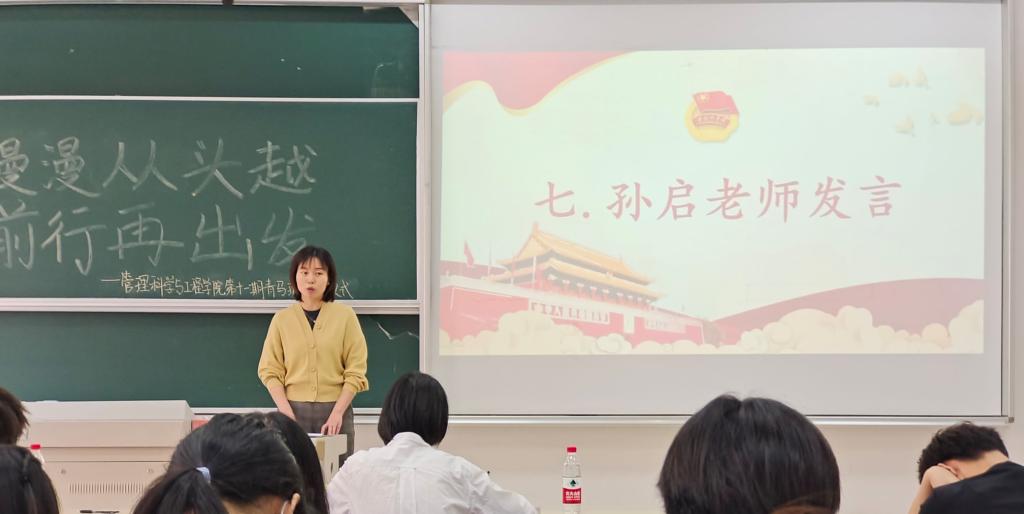 随后,党总支副书记孙启老师发言。孙启老师回顾了参加第十一期青马班开班典礼时的情景和青马班成员的一路成长。接着孙启老师分享了日常生活感悟,要求同学们不断学习,不断追求进步、提升就业深造的综合素养,让量变产生质变,铸就信仰之魂,让优秀变成一种习惯,做一个靠谱的好青年。