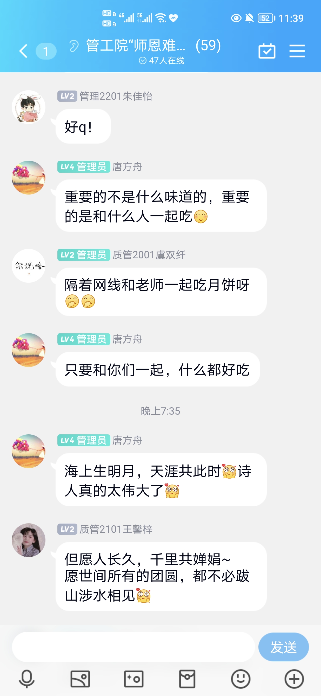 不少同学对这次活动有很深的感触。第一次参加大学活动的质管2201班的文韬同学说:“今天的活动很成功,很有特色。诗词大会给我的一个感受就是大家诗词储备很足,而且可以迅速反应,这是很难得的能力。再者就是贺卡很美很温馨。再到最后的猜灯谜,大家脑回路真的是一绝啊。”管理2101班刘名赫同学说:“这次中秋节不仅能和家人一起团圆,还和同学们一起线上云庆祝,相比之前的每一次,今年的中秋真正是一次大团圆,真的很开心!”质管2101班的刘寒驰说:“月亮拍了拍您说‘教师节快乐’!当中秋节遇上教师节,我们在同一天体会到了两个不同节日的氛围,线下阖家共度中秋,线上和老师同学欢乐互动,真是一种全新的体验,收获了双倍的快乐。”