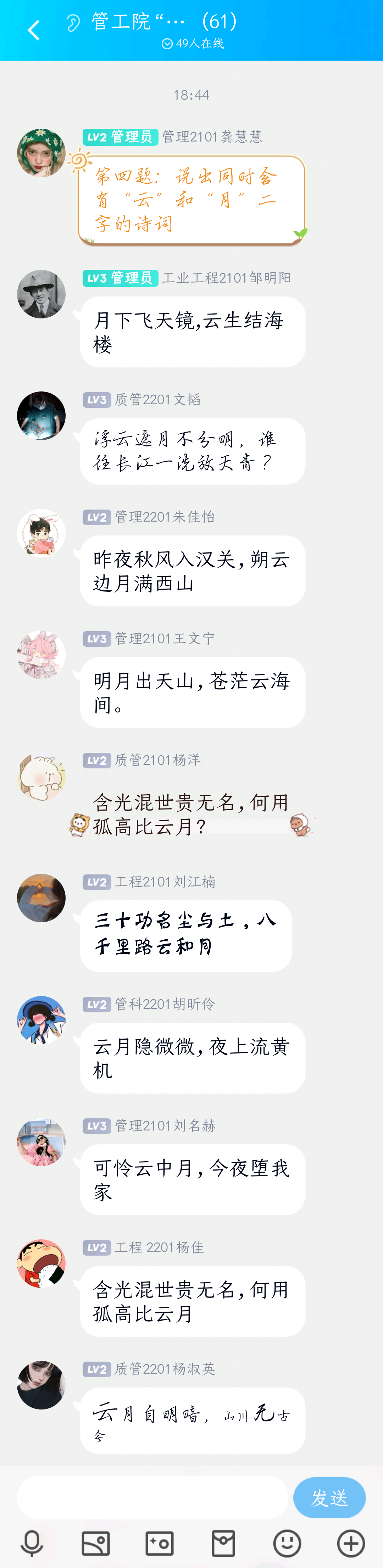 首先是线上诗词大会环节,“我寄愁心与明月,随风直到夜郎西”、“春江潮水连海平,海上明月共潮生”、“深林人不知,明月来相照”……同学们通过群聊玩起了飞花令,感受诗词之趣之美,气氛十分热烈。