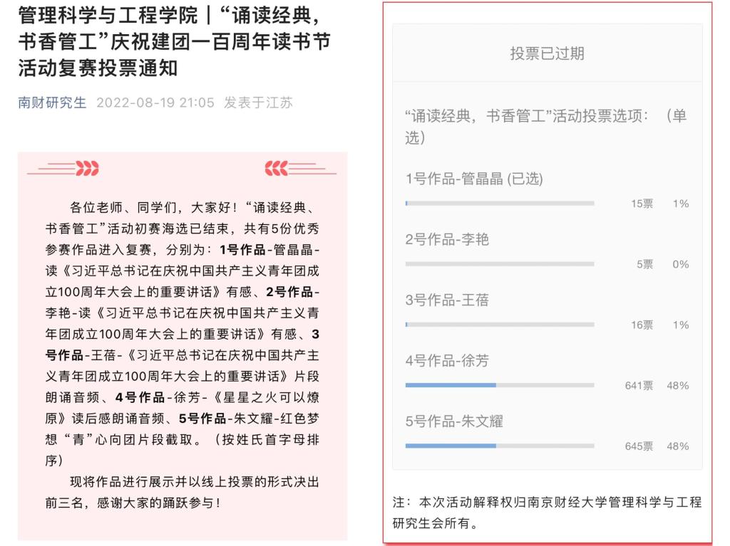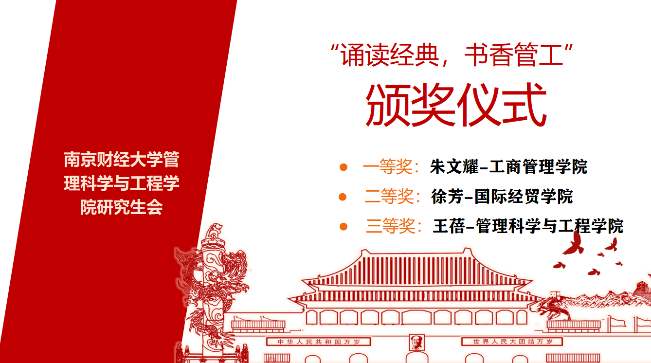 本次“诵读经典,书香管工”读书节主题活动于7月4日通过南财研究生公众号进行初赛报名,鼓励在校的研究生选取诵读经典和经典感悟两种展示方式进行线上参与,共收到12份作品,其中共有5份作品进入复赛。8月19日于南财研究生公众号进行复赛投票。经过激烈的投票环节,荣获前三名的同学为:朱文耀、徐芳、王蓓。来自工商管理公司的获奖者朱文耀同学说:“读书是一种自我提升的艺术,一本书有一个故事,一个故事叙述一段人生,一段人生折射一个世界,每一个我们所了解的世界片段,就又组成了一本书,这本书就叫人生。诵读经典不仅仅是对过去的怀念,更是对未来的充能。”