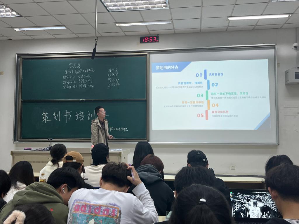 培训会由四个部分组成。首先,晏雨铭同学向大家仔细讲解了策划书的基本格式与撰写要求,并以优秀的策划书为例,向大家展示了一份完整的策划书的制作过程。最后,他分析了策划书的特点以及策划书与其他公文的区别,并提醒同学们在书写策划书过程中做好区分。各部门专心听讲并认真做笔记。