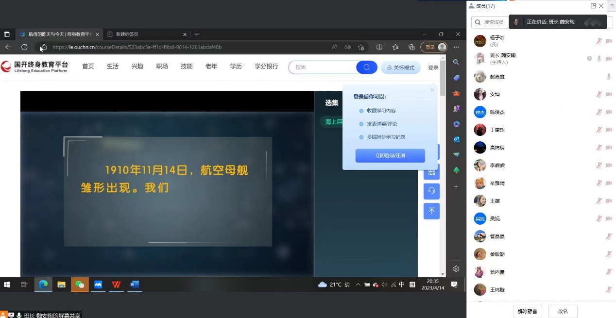 课程由国家开放大学终身教育平台提供视频,由中国人民解放军海军军事研究所的李杰专家讲述。通过这次课程,同学们深入学习了中国海军的发展史,了解了我国第一艘航空母舰的方方面面,大家纷纷表示受益匪浅。