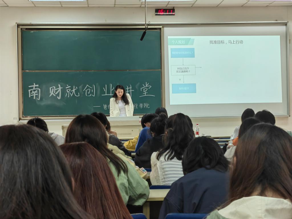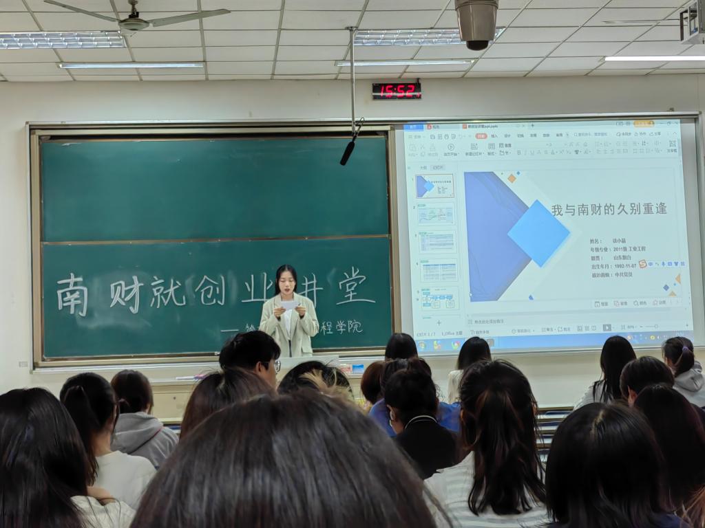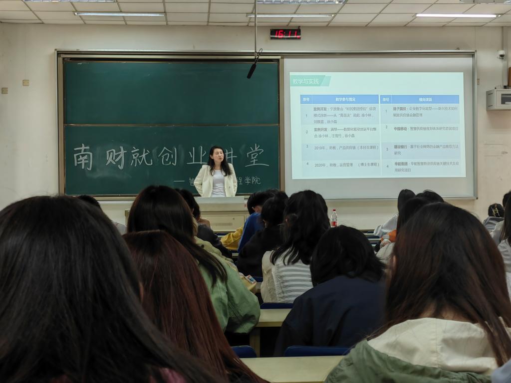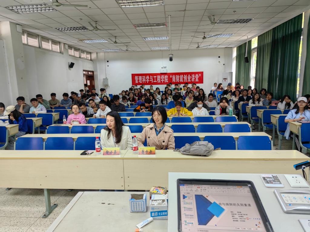 讲座分为嘉宾分享和现场答疑两个环节。讲座伊始,徐小晶老师首先分享了自己的教育经历。从南财学士开始,到东南大学硕士,再到南大博士,最后回到南财成为一名老师,徐老师将自己的求学之路娓娓道来。随后,徐老师讲述了自己的教学与实践,从教学参与情况和横向课题两个角度分享了自己丰富的实践经验。在场同学听得十分认真,教室时不时传出热烈的鼓掌声。