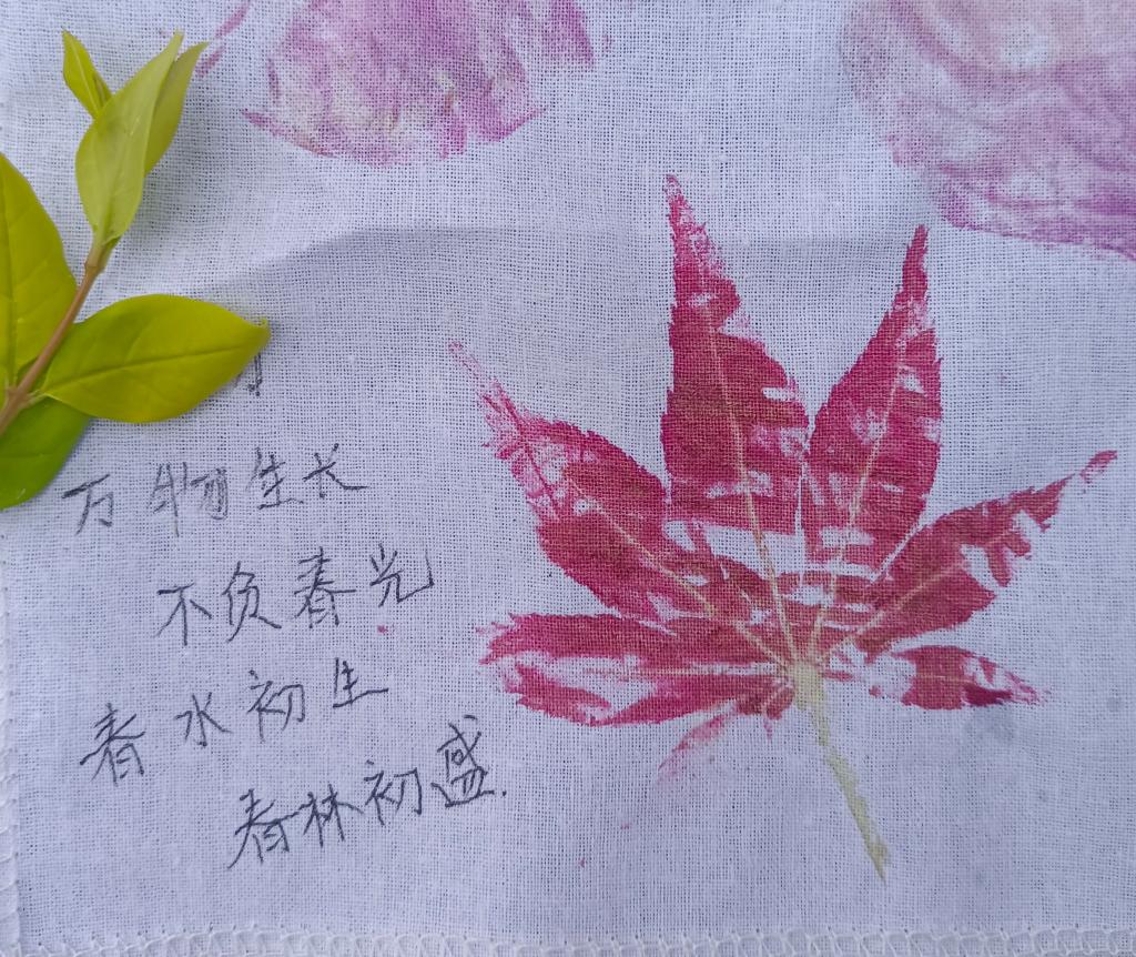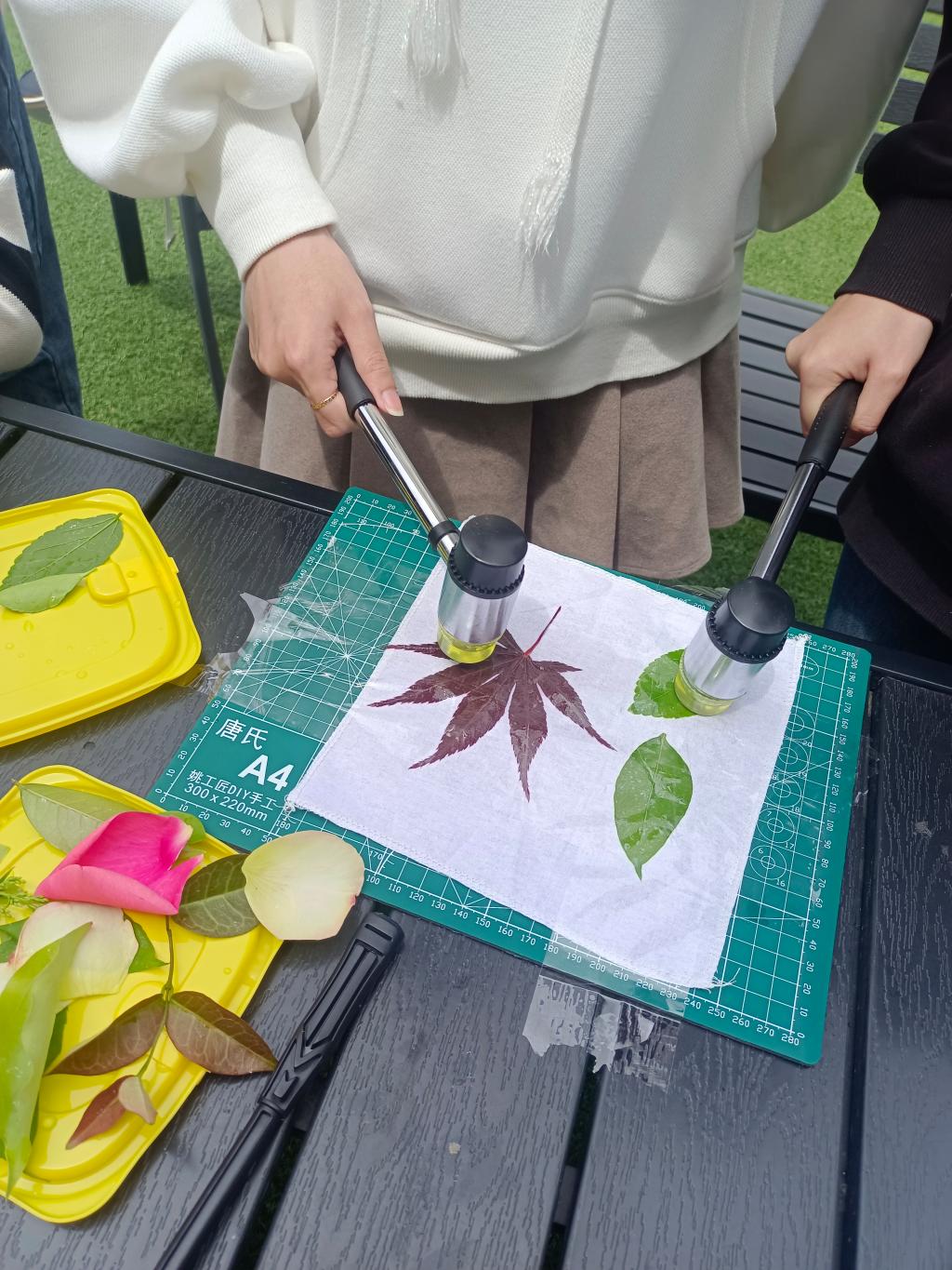 同学们随后开始锤草印花活动。捶草印花是河南省非物质文化遗产,捶草印花的名字便来自于制作的四个主要的环节和原料 “捶、印”“草、花”这四个字中。每一个字是一种工序,一幅画面,当它们组合在一起,又是一个故事,一种情怀。四时轮转万物生成、心理作画欣欣向荣。