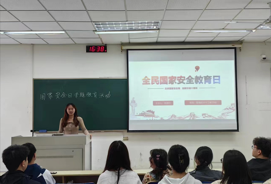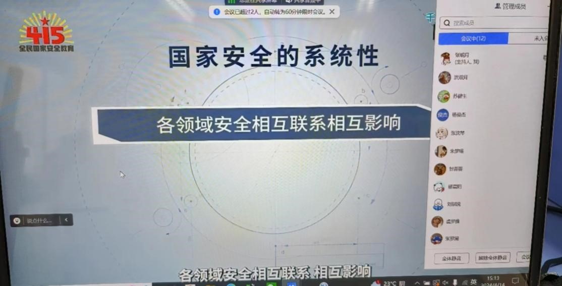 4月12日下午,2023级全体研究生围绕“总体国家安全观,创新引领十周年”这一主题,开展主题教育活动。本次班会,通过观看视频、交流讨论等方式从“国家安全的基本常识”、“危害国家安全的行为及相关法规”、“如何维护国家安全”、“谁来保护国家安全”四个方面展开。同学们更加深入地理解国家安全的含义和重要意义,增强了国家安全意识,深刻认识到维护国家安全的青年的责任与担当。