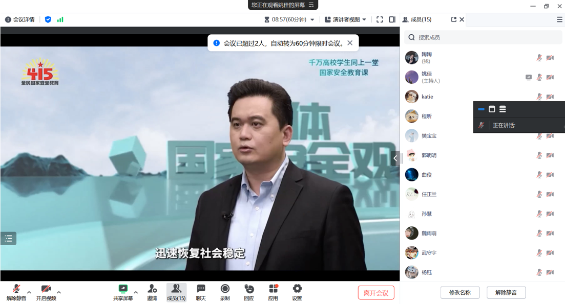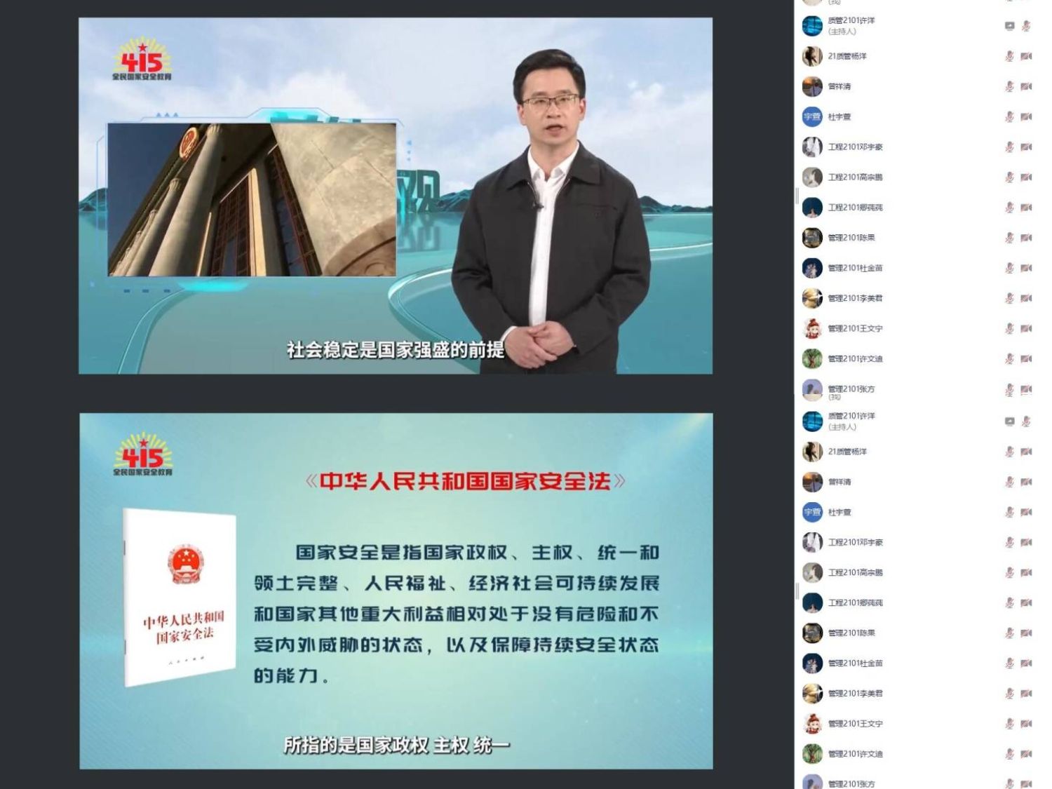 4月14日,公司本科生、研究生各班级通过腾讯会议观看“千万高校员工同上一堂国家安全教育课”。此次课程由北京师范大学汪明教授、上海财经大学曹啸教授、国防科技大学军政基础教育公司赵云副教授主讲。