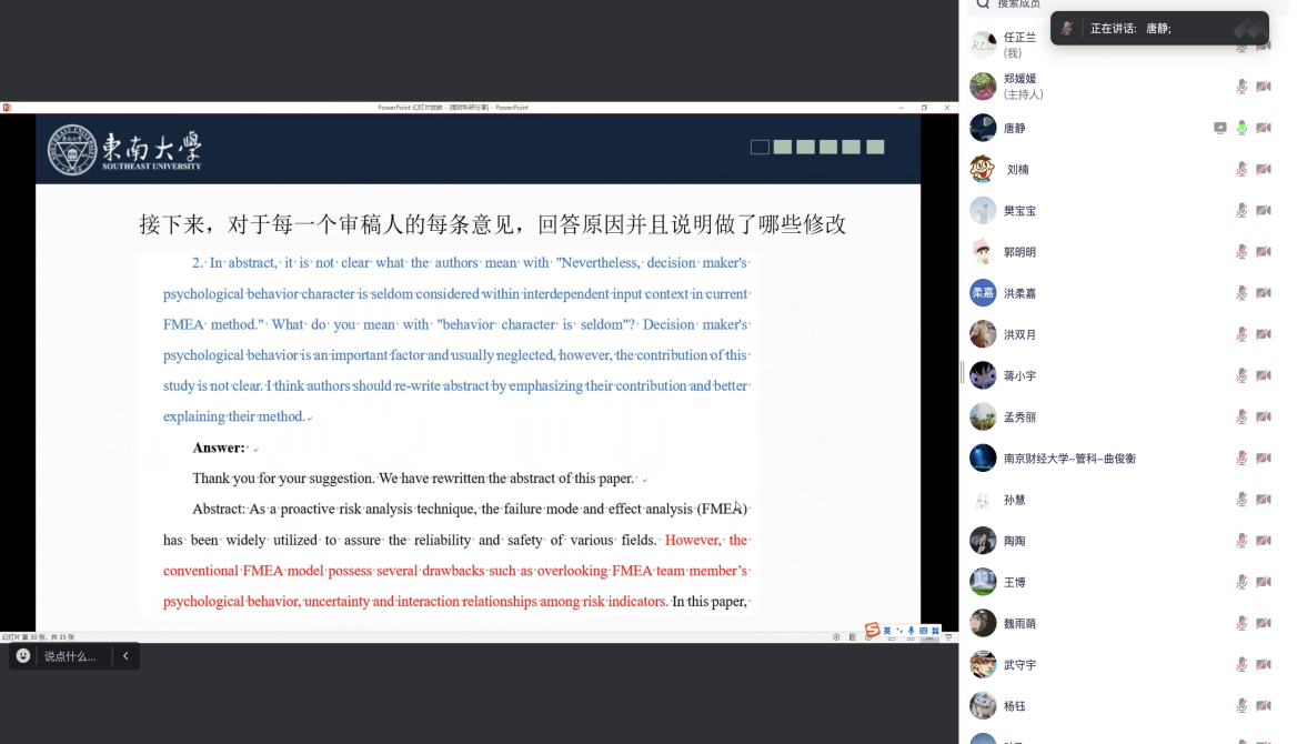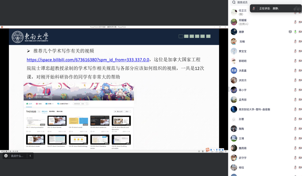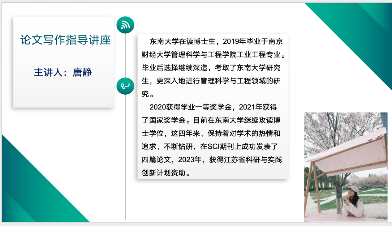 为进一步提升研究生的论文写作能力,帮助研究生攻克学术难题,结合研究生遇到的困难与现实需求,XCsports于2024年4月17日晚19:30,通过腾讯会议举办学术论文写作交流会,主讲嘉宾是公司优秀员工——工业工程专业2019届毕业生唐静,现为东南大学博士研究生,分管公司研究生工作副经理孟秀丽教授做总结和指导,2023级、2022级管理科学与工程和工程管理专业研究生悉数参加,研究生辅导员郑媛媛老师主持会议。