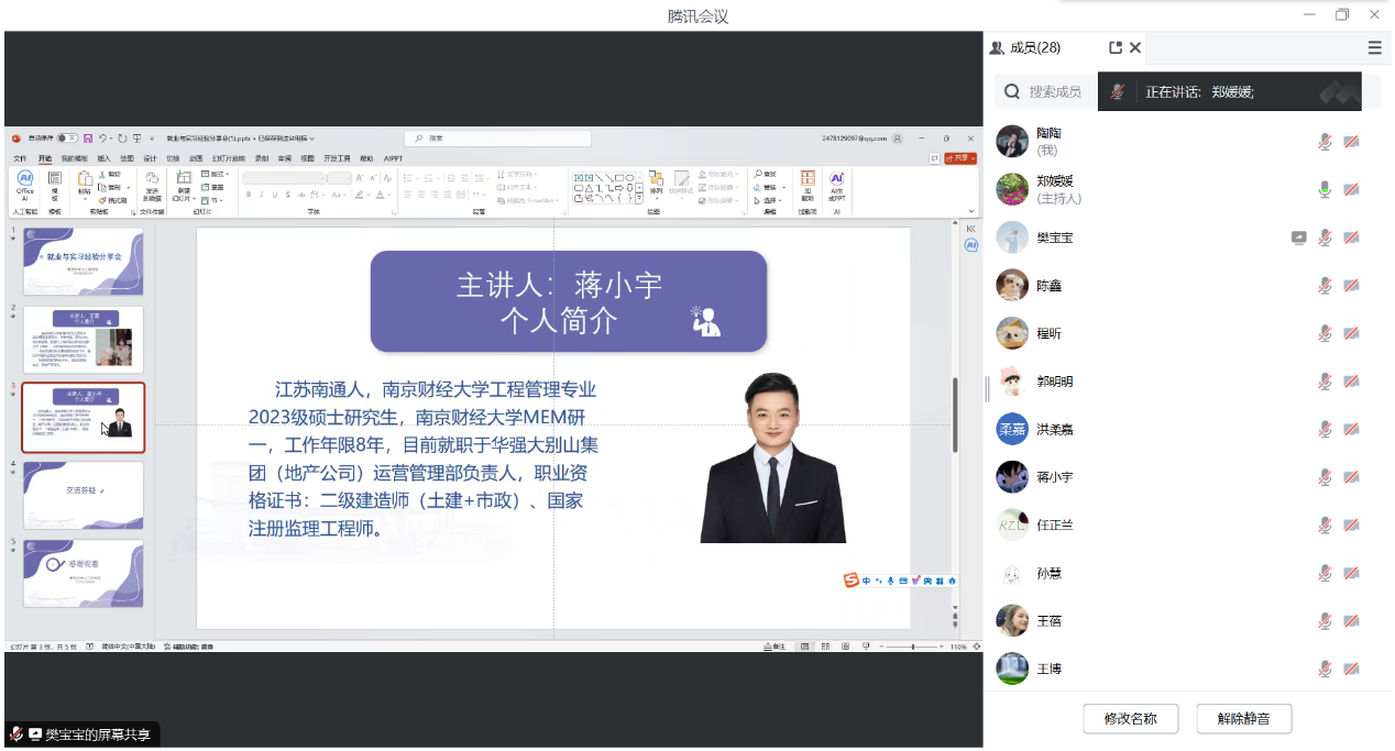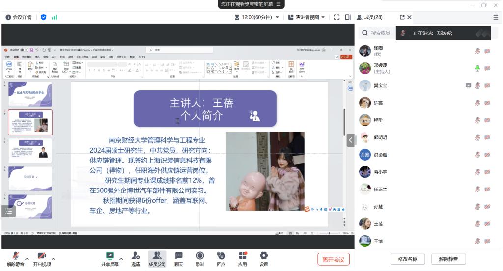 会议开始,郑老师热情介绍了两位主讲嘉宾,并表达了感谢。王蓓:研究方向是供应链管理,签约上海识装信息科技有限公司(得物),任职海外供应链运营岗位;秋招期间,她获得6份offer,涵盖互联网、车企、房地产等行业。蒋小宇:工作年限8年,目前就职于华强大别山集团(地产公司)担任运营管理部负责人。
