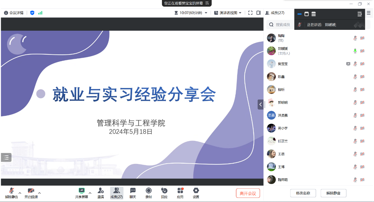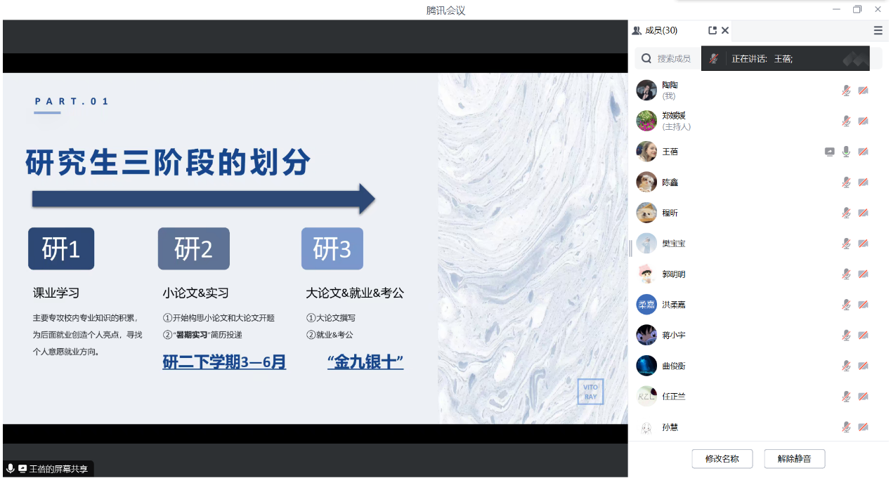 为帮助公司研究生更好规划就业目标和未来发展,2024年5月18日晚,XCsports研究生班级通过腾讯会议,举办就业与实习经验交流会,邀请管工21级研究生王蓓、工程管理23级研究生蒋小宇进行了经验分享并代表公司进行招聘。管工2022级、2023级研究生悉数参加,研究生辅导员郑媛媛老师主持会议。