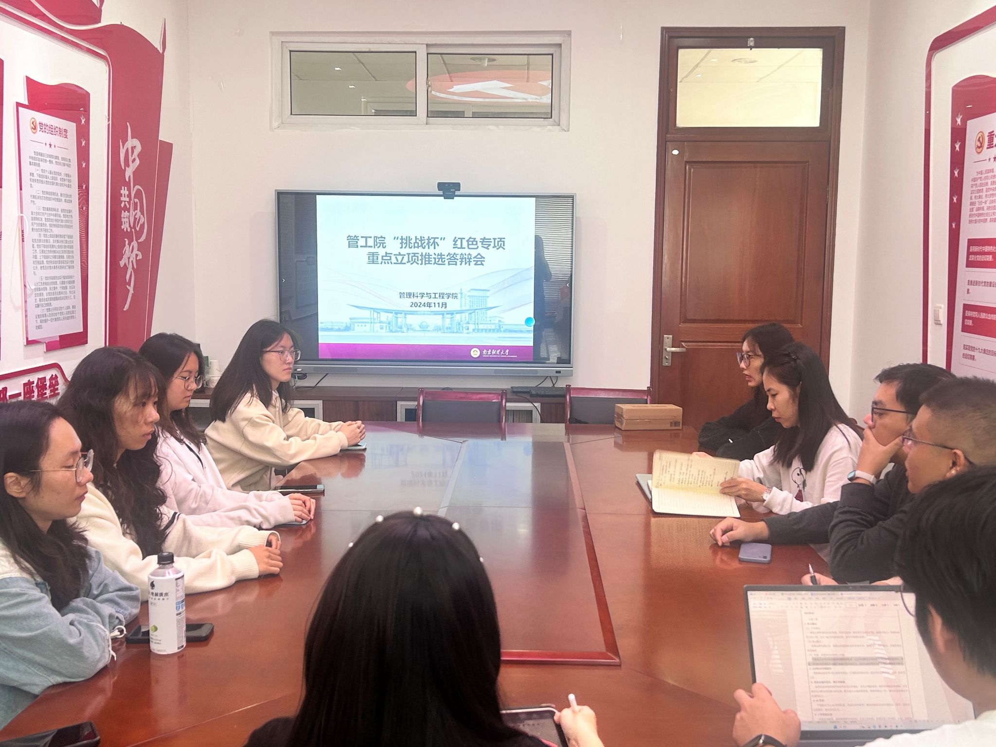 首先,团队队长管理2201班丹增卓嘎从项目背景、典型案例、解决方案对参与立项的项目进行了陈述。在答辩过程中,杨帆老师和徐祥老师提出了针对性的建议,并希望大家在项目研究中能有更加清晰的思路。朱晓滢和聂鹏结合自身参赛经历,与在场的同学分享了“挑战杯”红色专项比赛经验,对项目进行了具体的修改指导。