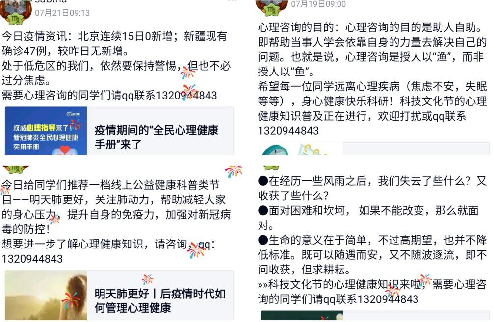 另外,在活动期间研究生院为同学们印刷疏导心理问题相关的图片和阅读材料,并邮寄给每位同学。以上是疫情未开学时期科技文化节心理健康的宣传活动和线上解答大家的困惑。在活动期间,我们邀请心理辅导老师通过群电话或群视频定期开展线上访谈活动,针对大众关心的问题,通过有问有答的形式深入浅出的讲解老员工的心理特点、如何保持心情平和等。