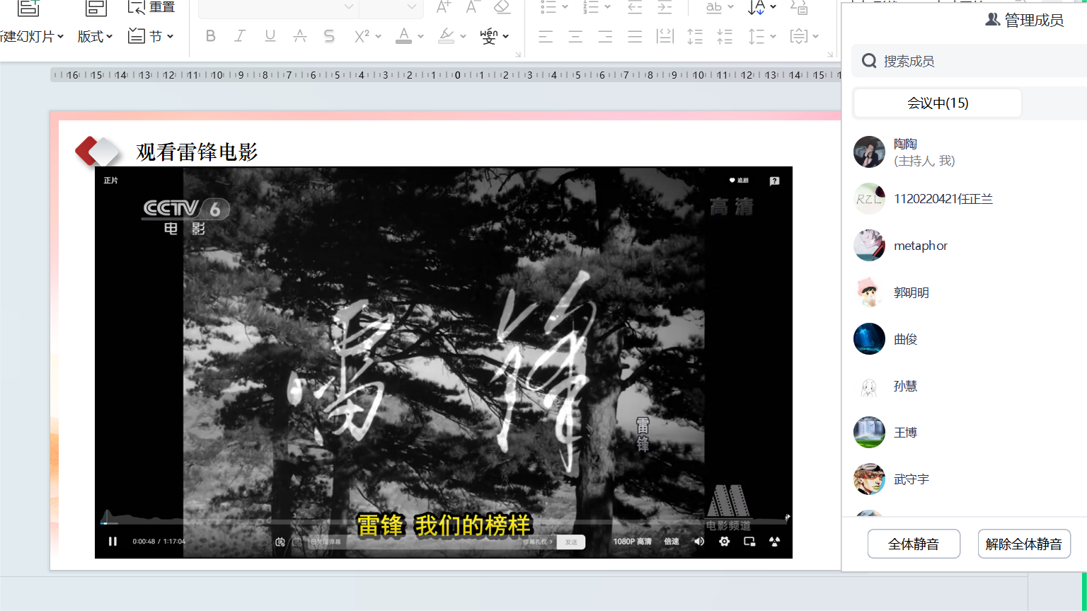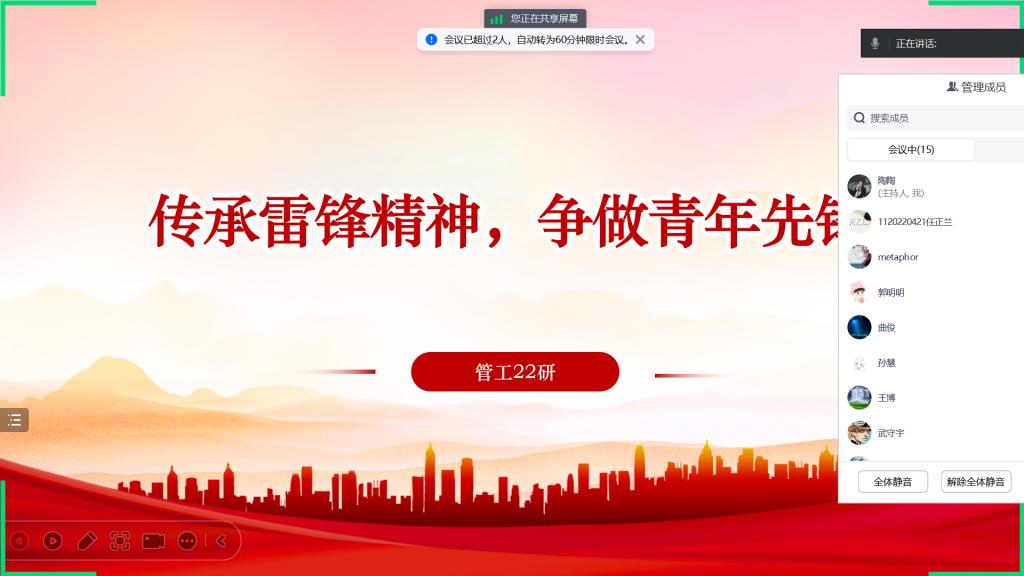 在传承雷锋精神、引导员工树立正确的价值观和社会责任感的号召下,管工22级全体研究生于2024年3月29日晚举办了一场别开生面的学雷锋团日活动。活动以"传承雷锋精神,争做青年先锋"为主题,旨在激励青年学子将爱心与奉献融入到日常生活中,成为有社会责任感的新时代青年。本次活动由团支书陶陶主持。