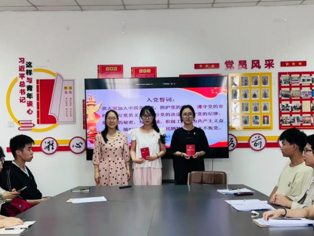 会上,公司党委书记金立林老师为新发展的两位预备党员赠送《中国共产党章程》、佩戴党徽,这一环节既是对新党员的认可与期许,也意味着他们正式肩负起党员的责任与使命。接下来,党支部书记张沈琴同志领誓,全体党员重温入党誓词,在庄严的宣誓中回望初心,强化党员意识,凝聚奋进力量。