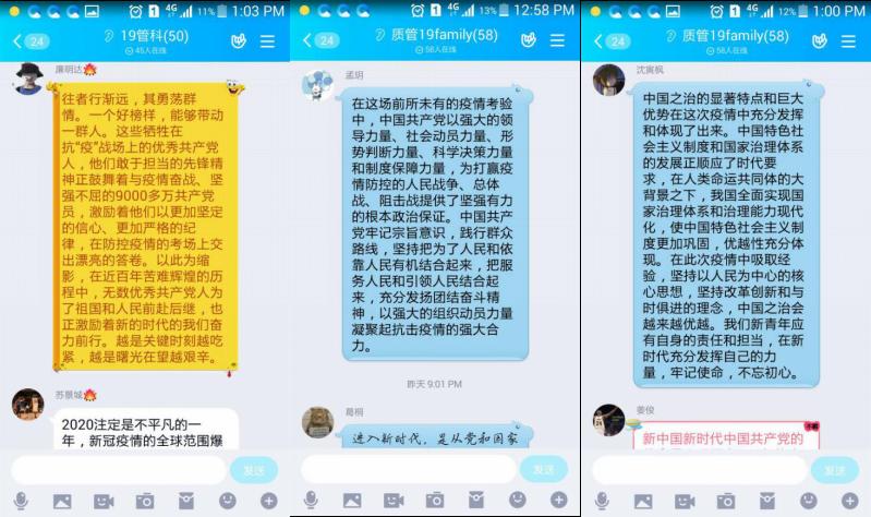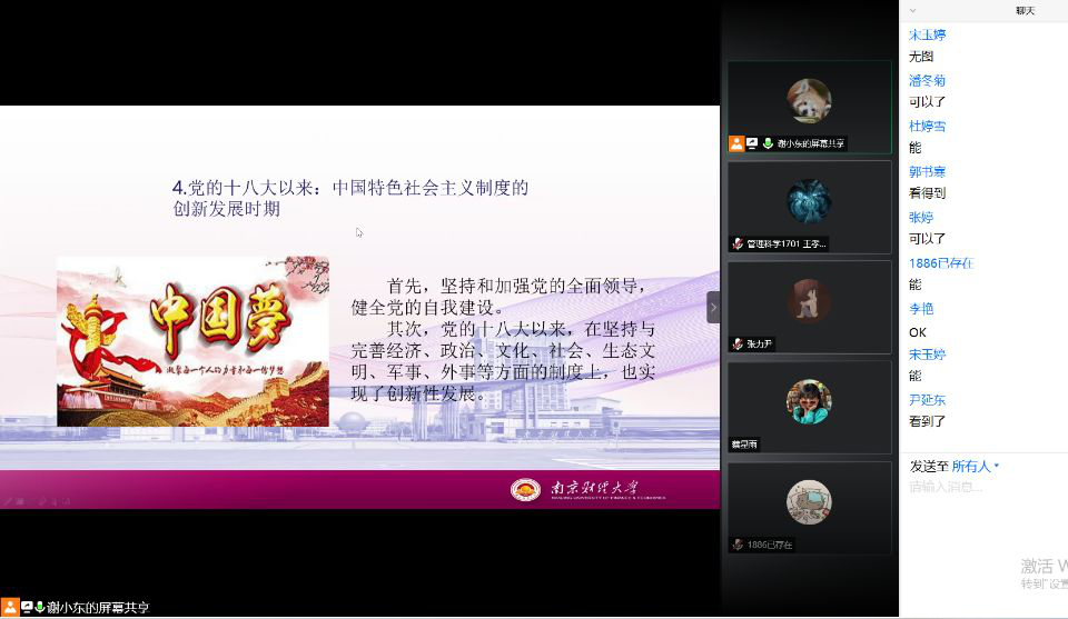 会议开始,郑老师先介绍了会议主题和内容流程。接着,谢小东分享了中国之治的视频,讲述中国之治的内涵与意义和发展过程、党的十九届四中全会精神中国特色社会主义制度的13个显著优势、中国之治的走向以及如何坚定制度自信。他的宣讲主要从理论角度深化同学们的政治理论认识。第二部分由王孝攀联系中国抗击疫情的现实,讲述习近平总书记关于疫情防控工作各阶段的重要讲话精神,中国制度显著优势和中国精神在抗击疫情中的彰显,“90后”在抗击疫情中的感人事迹。他说,我们要以90后北大援鄂医疗队的青年党员为榜样,为了国家和人民的利益,面对危险和困难冲锋在前,勇于奉献,不怕牺牲。郑老师总结发言:党领导中国从站起来,到富起来,再到越来越强大,今天中国取得的来之不易的战疫成果,根本在中国共产党的坚强领导,中国特色社会主义制度的强大保障,全国人民的万众一心。作为新时代的青年,要牢记我们都是中国人,爱国爱党爱人民爱社会主义,坚定“四个自信”,筑牢“四个意识”,听党话,跟党走,接过时代的接力棒在新长征路上跑出更好的成绩,为实现伟大的中国梦奉献力量!宣讲会结束后,同学们在班级QQ群讨论交流,踊跃发表学习感想。