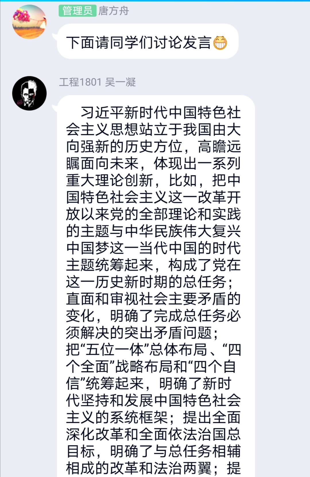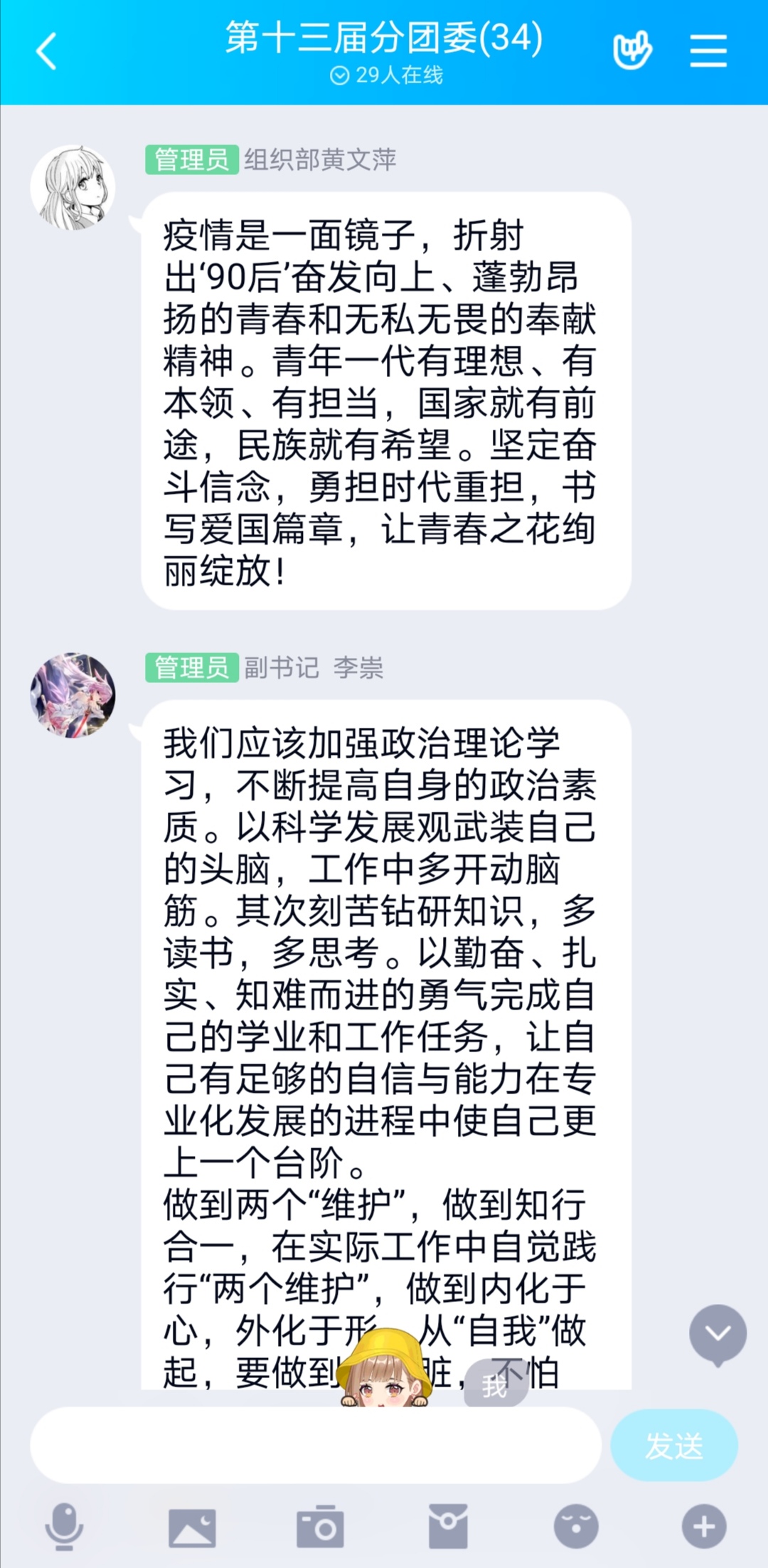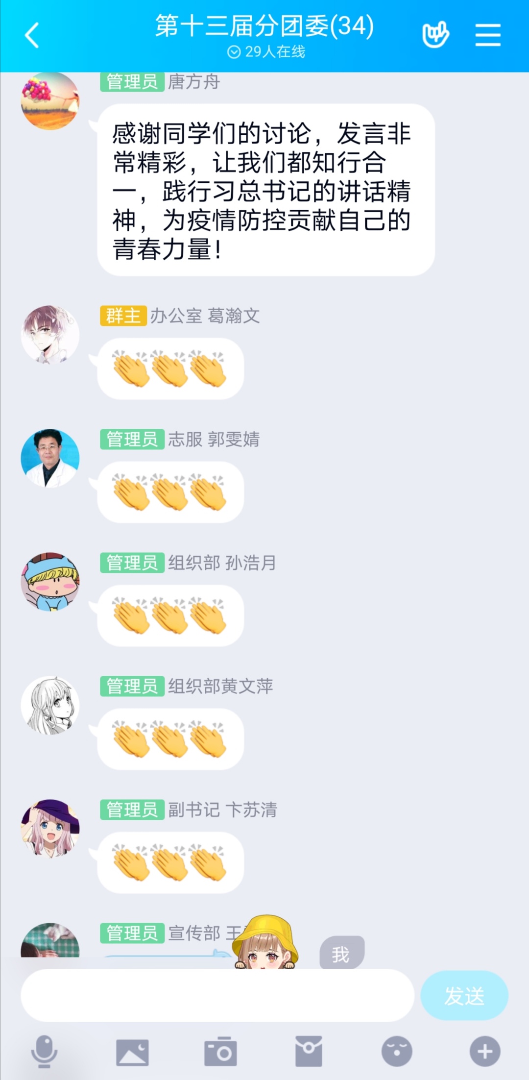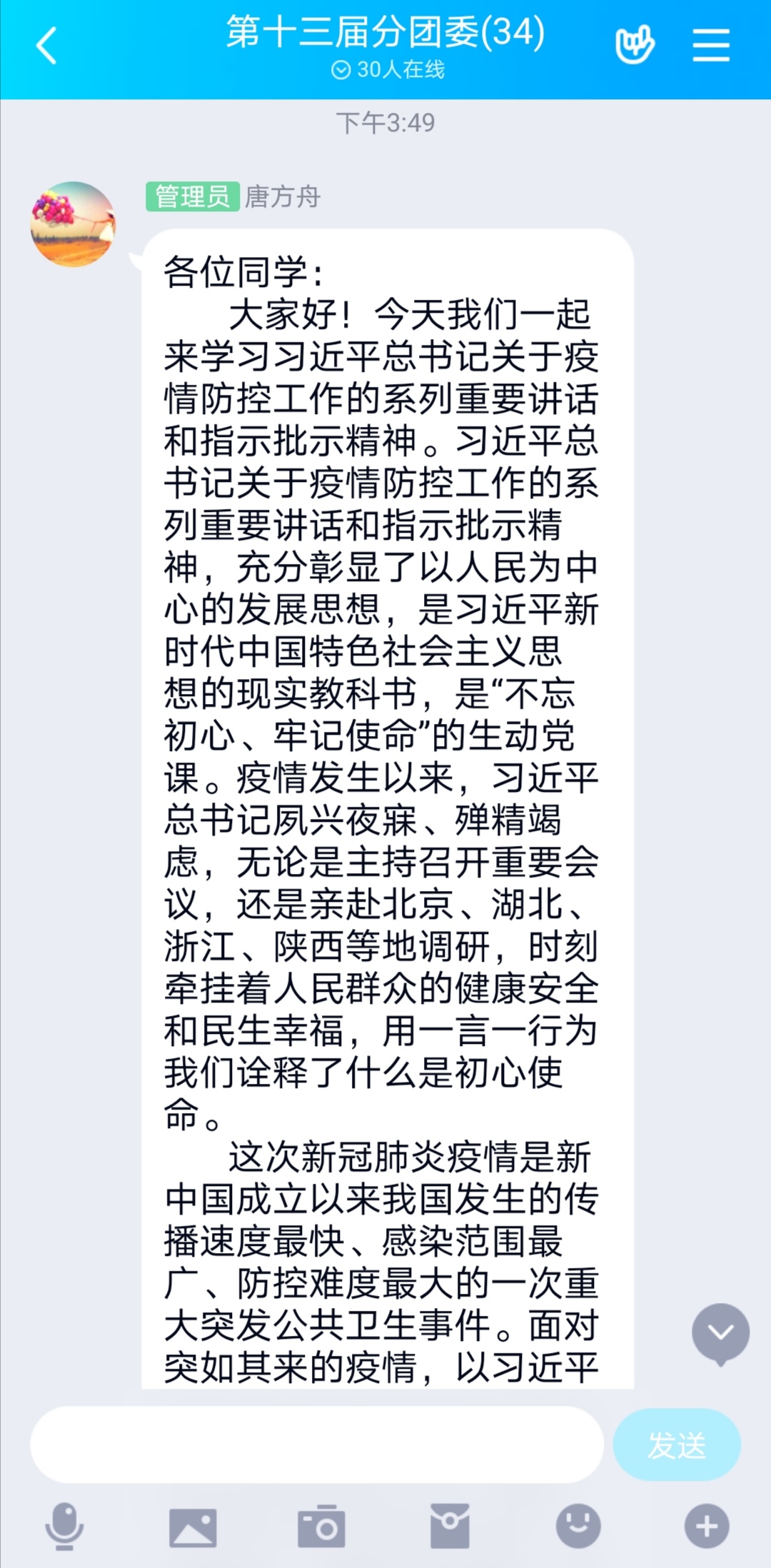 随后,同学们踊跃发言,分享学习习近平总书记关于疫情防控工作的系列重要讲话和指示批示精神的感悟,并纷纷表达了当代青年老员工的自我要求;最后,唐方舟老师鼓励大家知行合一,继续为疫情防控贡献出自己的青春力量。